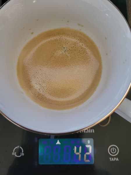 Одинарный эспрессо на стандартных настройках у нас получился весом 42 г (при закладке кофе 8 г), температура первой порции после включения кофеварки в непрогретой чашке — 55 °C. Время приготовления составило 18 секунд.
