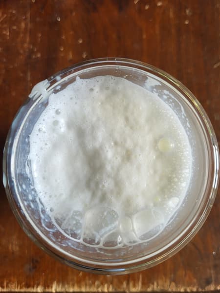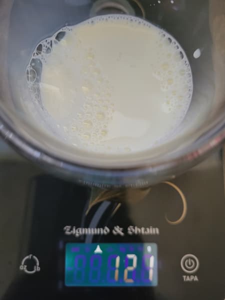 У нас, конечно, пропорции немного изменились, мы взяли 120 г молока и попытались взбить пену.