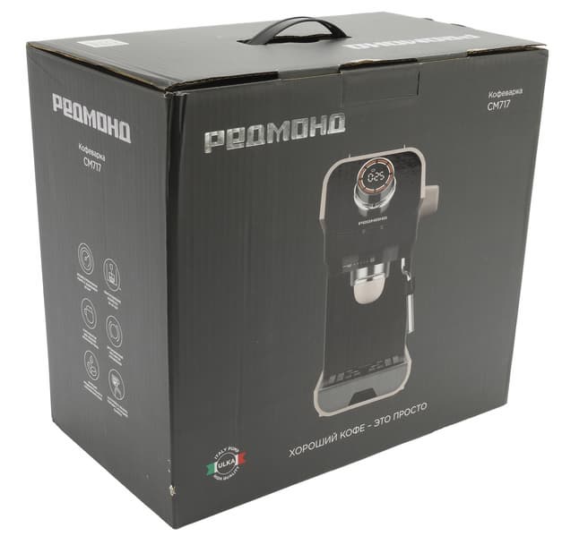Кофеварка Redmond CM715 упакована в стильную черную картонную коробку с логотипом бренда. На упаковке размещено фото устройства и перечислены его ключевые параметры. Внутри аппарат надежно зафиксирован пенопластовыми вставками, предотвращающими повреждения при транспортировке.
