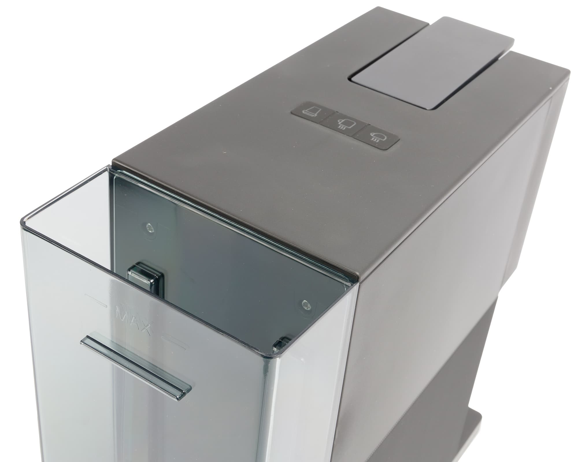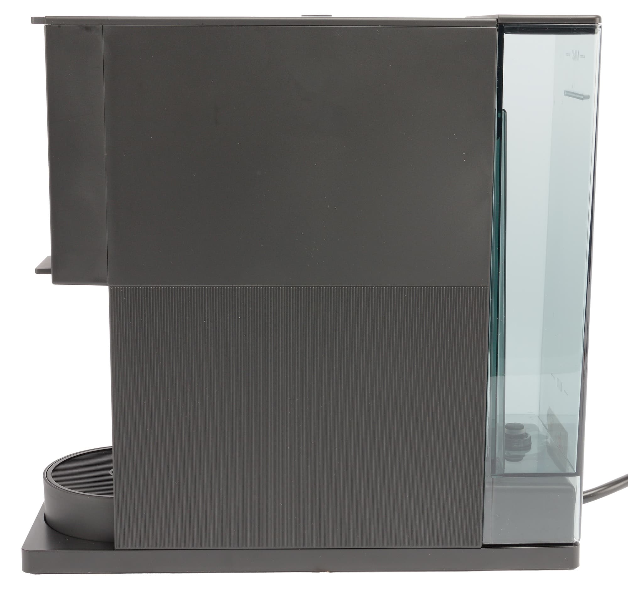 Боковые поверхности лаконичны и лишены лишних элементов — здесь можно рассмотреть кофеварку в профиль и оценить встроенный пластиковый резервуар для воды.
