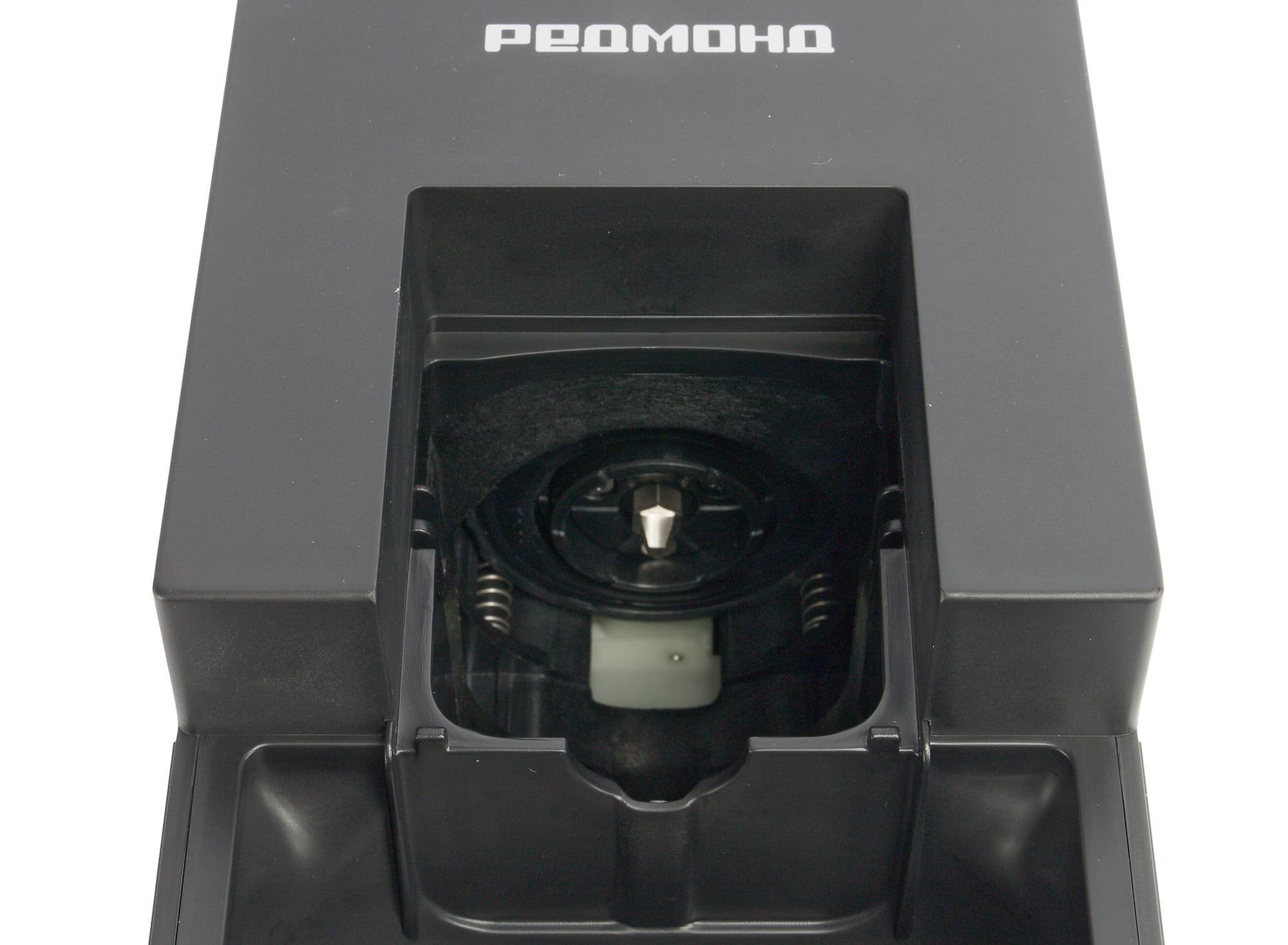 На следующем фото показано внутреннее устройство отсека для адаптера: видны направляющие пружины, фиксирующие адаптер, и игла, которая прокалывает капсулу и подает воду.