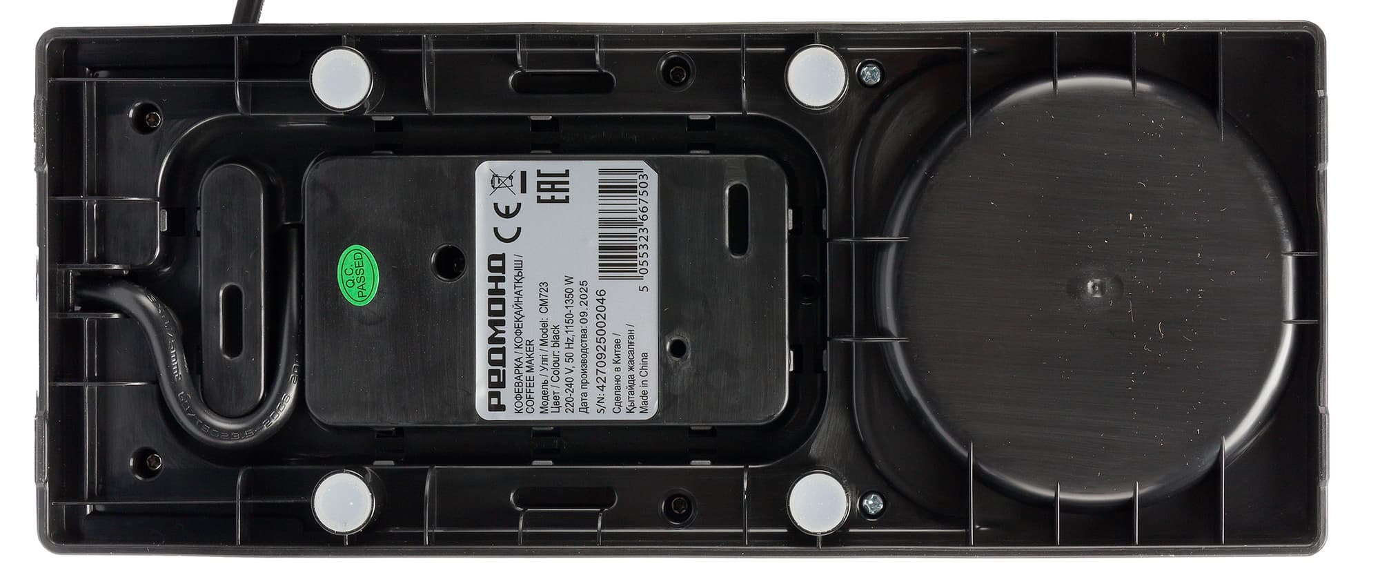На нижней панели находятся резиновые ножки, предотвращающие скольжение устройства, шильдик с информацией о производителе и выход электрического шнура.