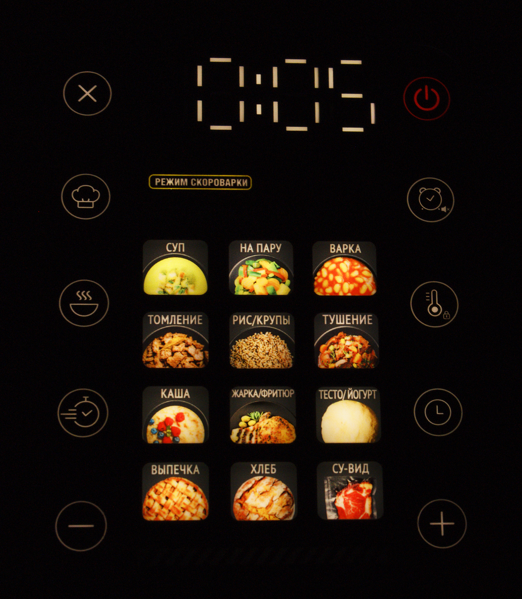По центру панели управления расположены иконки выбора автоматических программ приготовления. Всего автоматических программ 14, причем они интересным образом делятся на программы для работы в режиме мультиварки и на программы для работы в режиме скороварки.