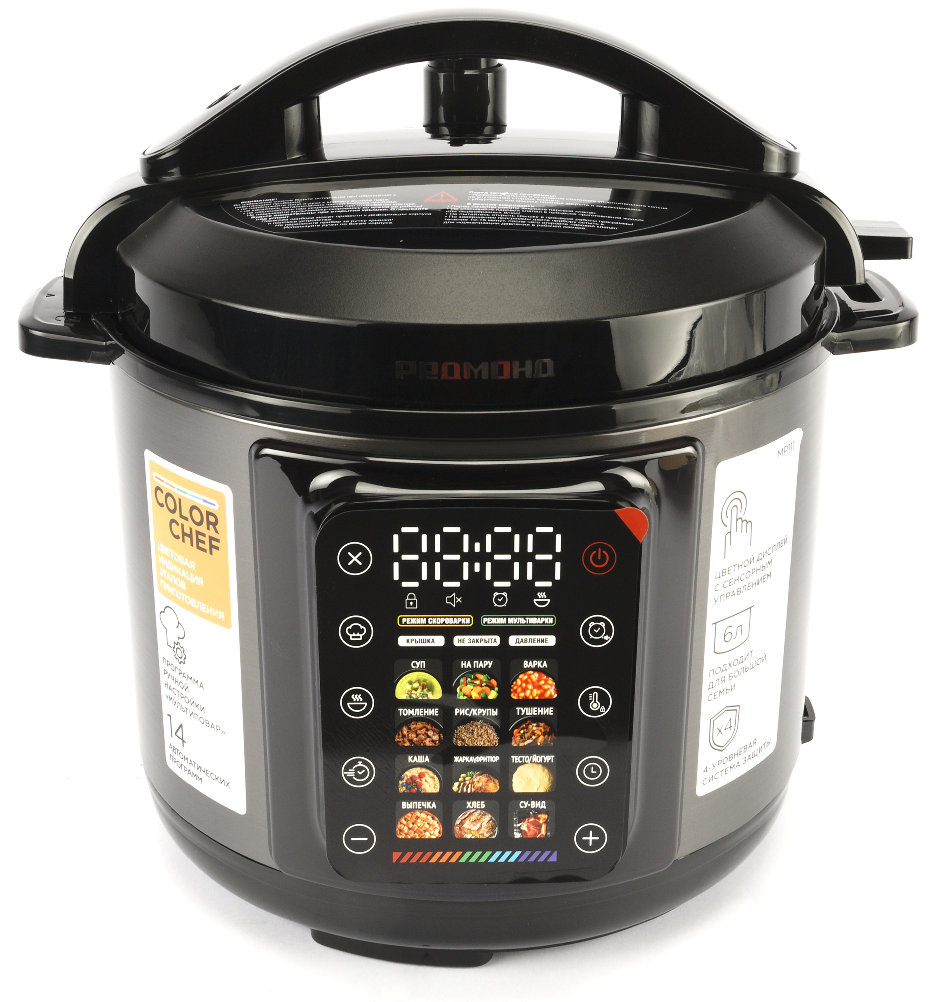 Красочные иконки на сенсорной панели, функция Color Chef, отложенный старт, регулировка времени и температуры в зависимости от блюда, возможность работы в режиме скороварки и медленноварки — всё это является несомненными достоинствами Redmond Fast Chef MP111. Хотелось бы только посоветовать создателю наклеек быть более внимательным.