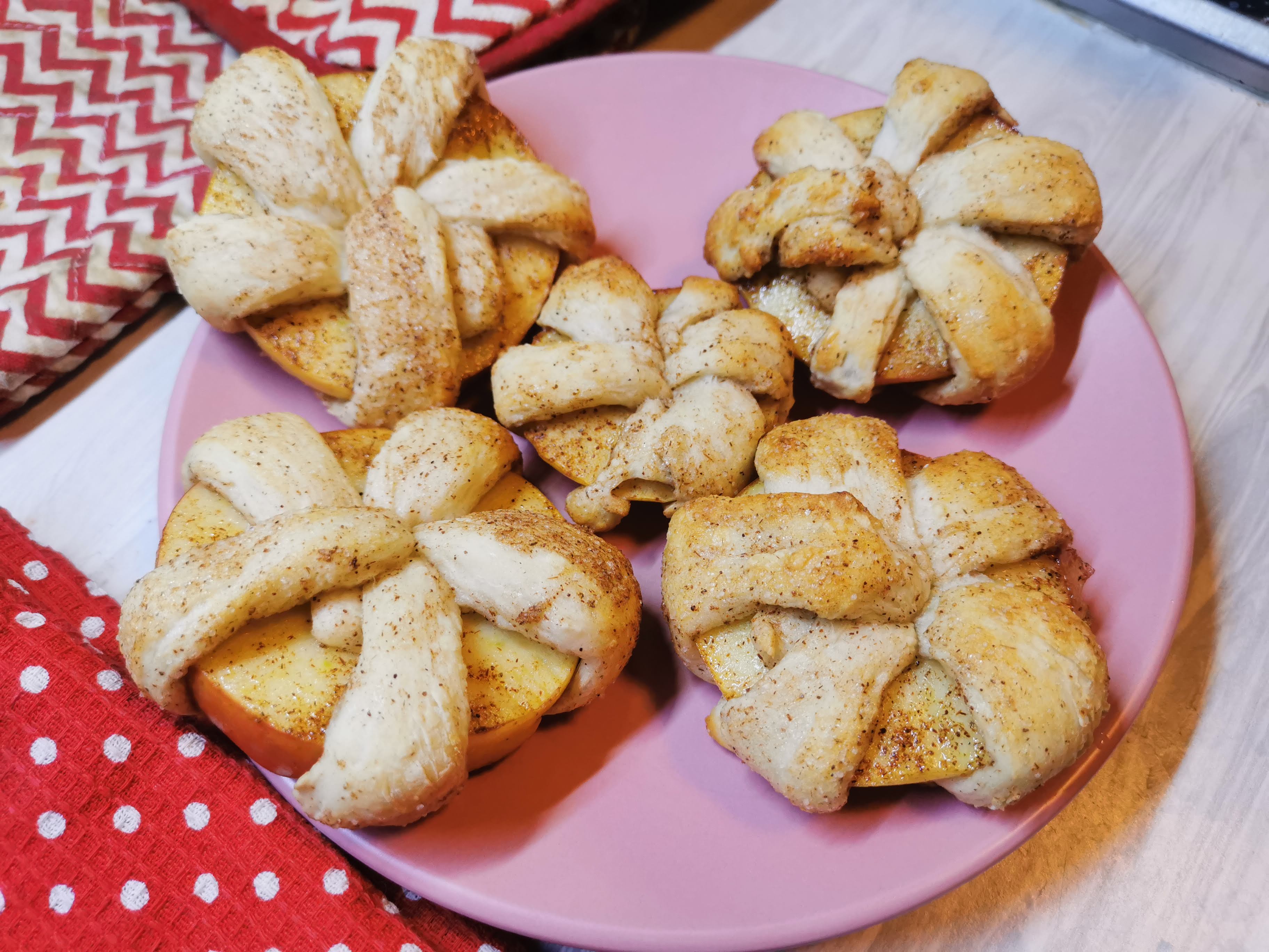 Но получили! Яблоки пропеклись, тесто подрумянилось, сахар карамелизовался, и вся наша кухня пахла корицей. Получилось очень просто и еще более вкусно.