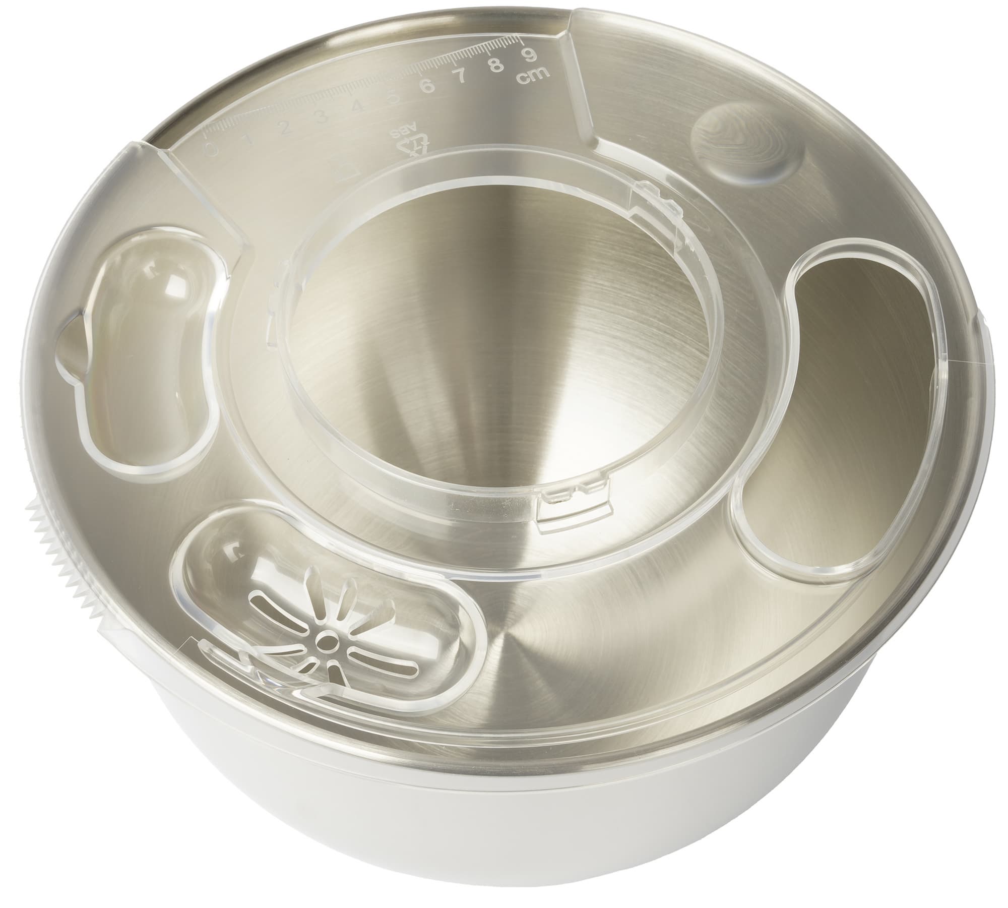 Для защиты от разбрызгивания при взбивании и смешивании ингредиентов производитель добавил пластиковую прозрачную крышку. В крышке также имеется отверстие для загрузки продуктов, разделитель белков и желтков, линейка и зазубренный край, которые пригодятся в работе с готовым тестом. Крепится крышка посредством поворота внутри специального углубления на откидной части моторного блока, с помощью трех пластиковых ограничителей.