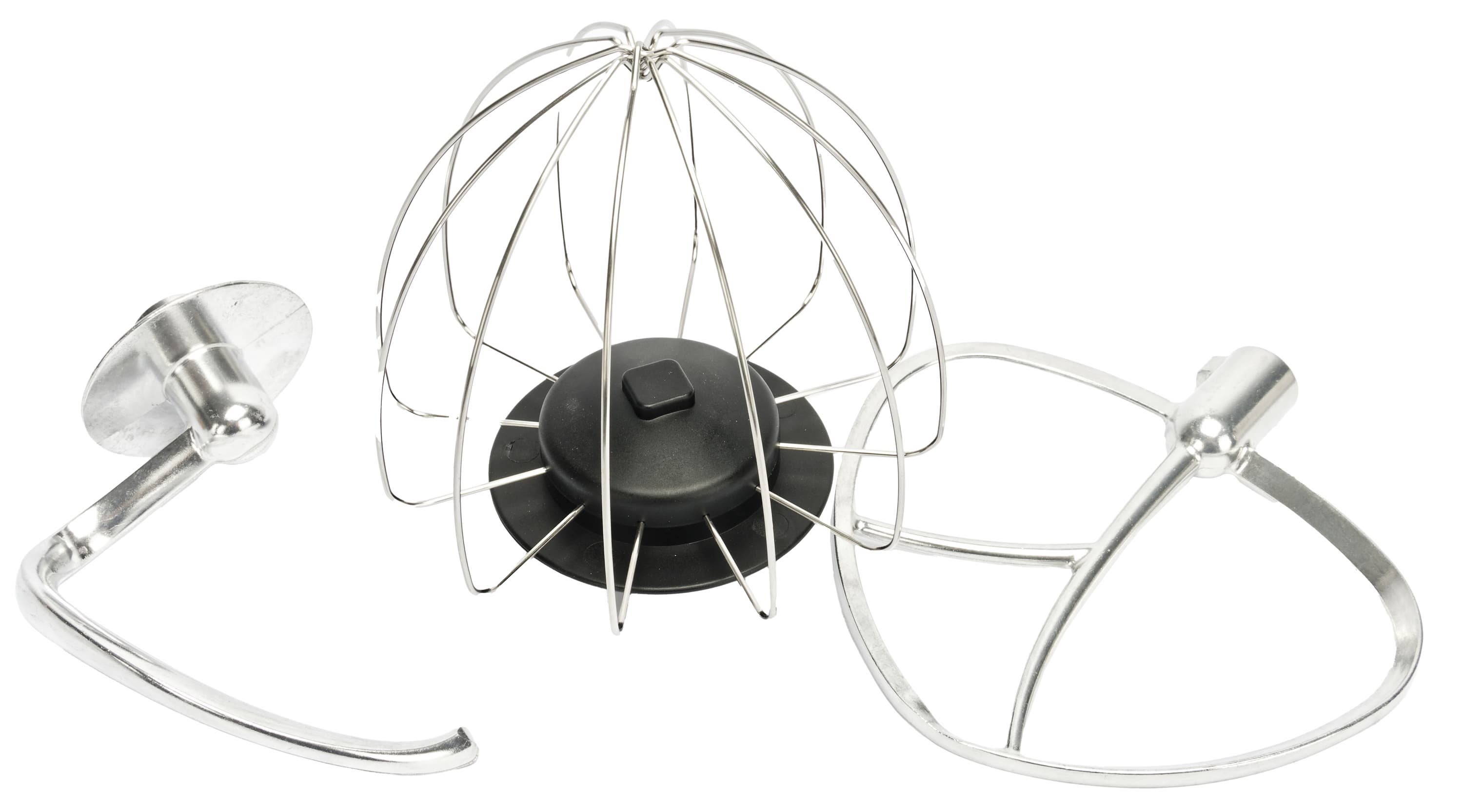 В комплекте идут три насадки: венчик для взбивания, крюк для замешивания теста, насадка для смешивания мягких продуктов. У венчика 6 стальных дуг, крюк и насадка для смешивания силуминовые.