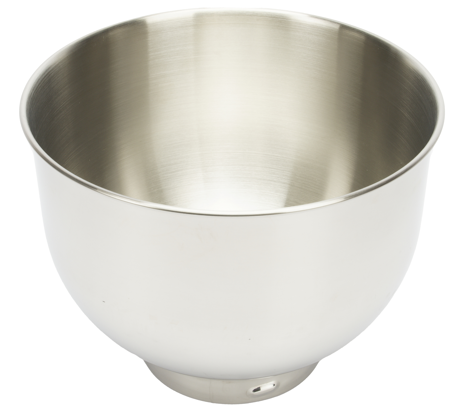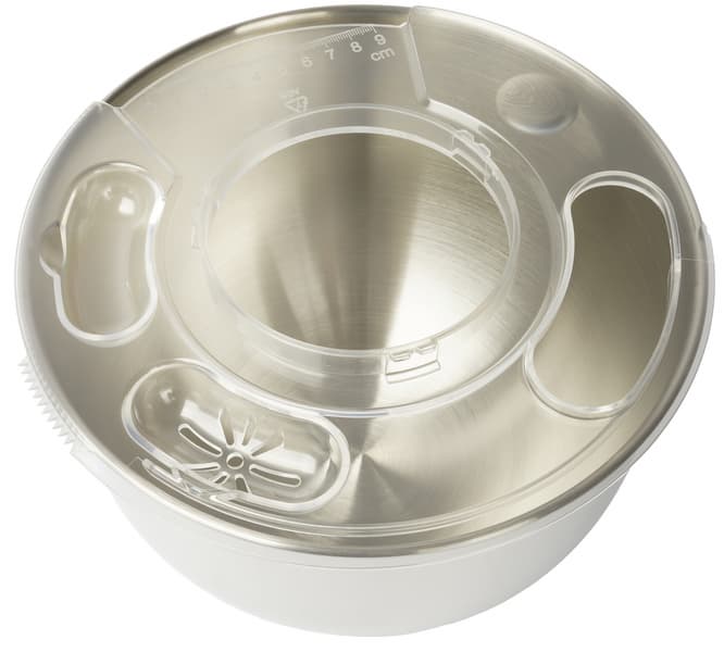 Округлая дежа объемом 5 л выполнена из нержавеющей стали. Ко дну она сужается и на получившейся ступеньке имеются 3 небольших объемных выступа, благодаря которым она крепится посредством байонетного соединения в основании корпуса.