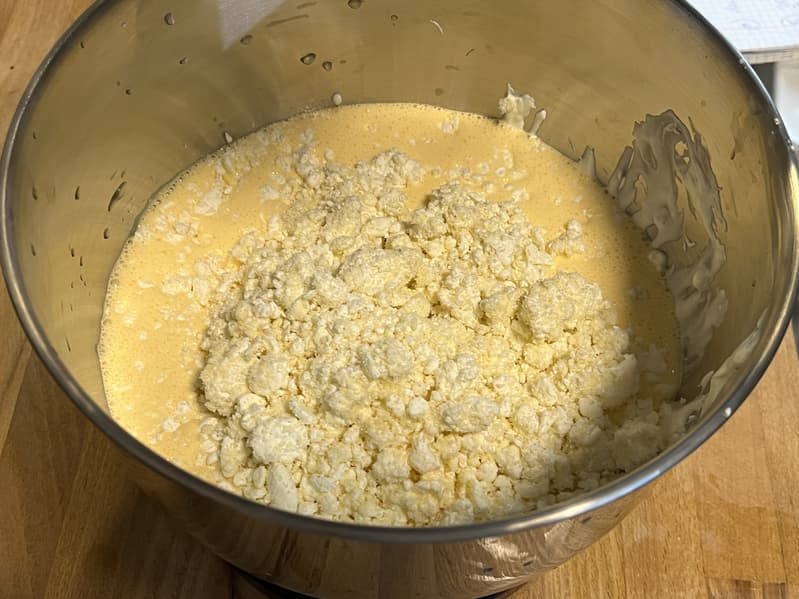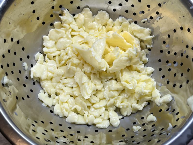 Мы переложили получившиеся комочки в дуршлаг, чтобы стекла образовавшаяся сыворотка. После чего соединили все кусочки с помощью силиконовой лопатки.