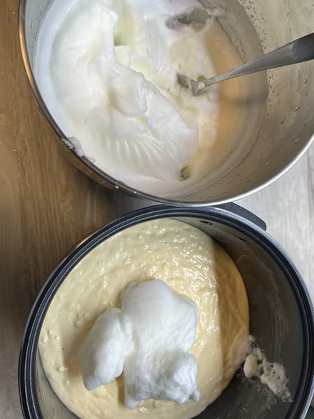 Затем смазали форму для выпекания сливочным маслом, аккуратно вмешали белковую пену в основное тесто с помощью ложки и отправили запеканку выпекаться.