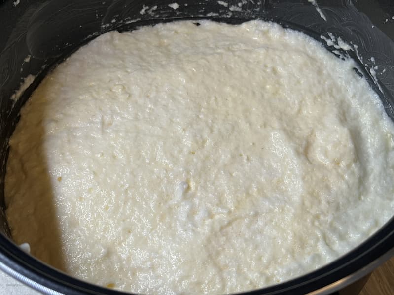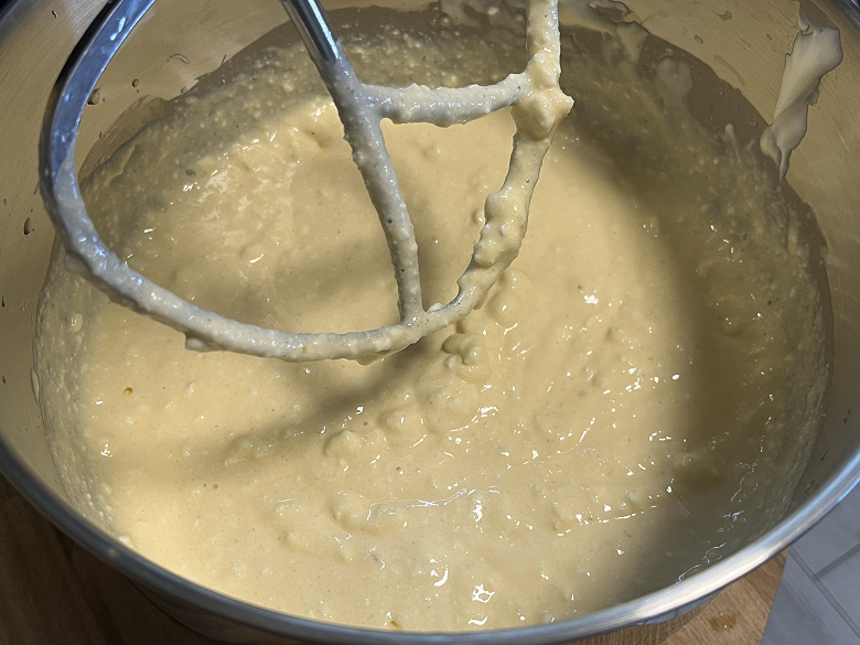 Не трогая ингредиенты, установили насадку-крюк, поставили дежу в основание миксера и запустили работу на 3-й скорости.