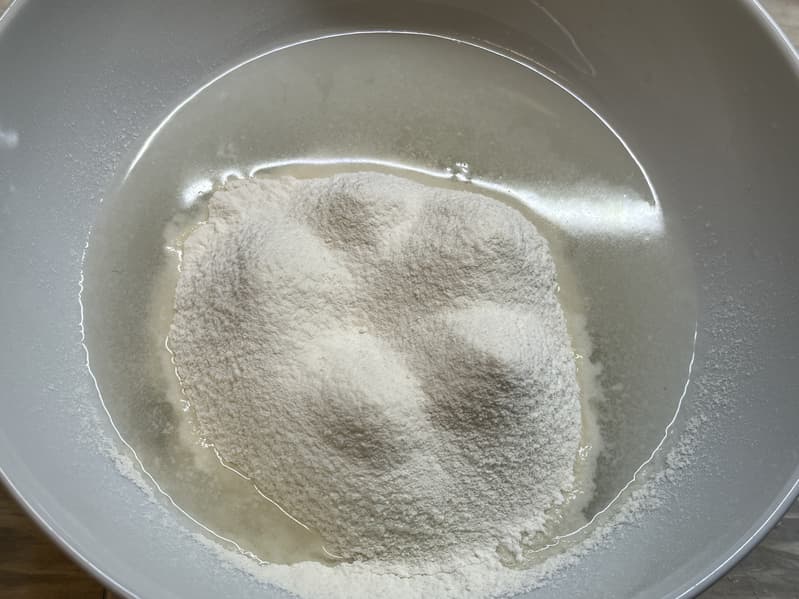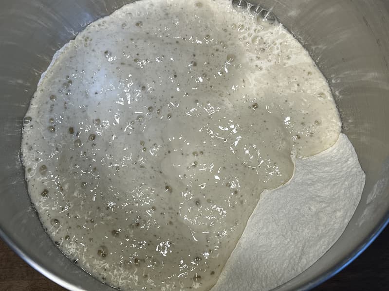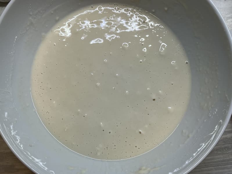 Растворили дрожжи с сахаром и 150 г просеянной муки в теплой воде и оставили опару постоять 20 минут, чтобы ускорить реакцию дрожжей в готовом тесте.