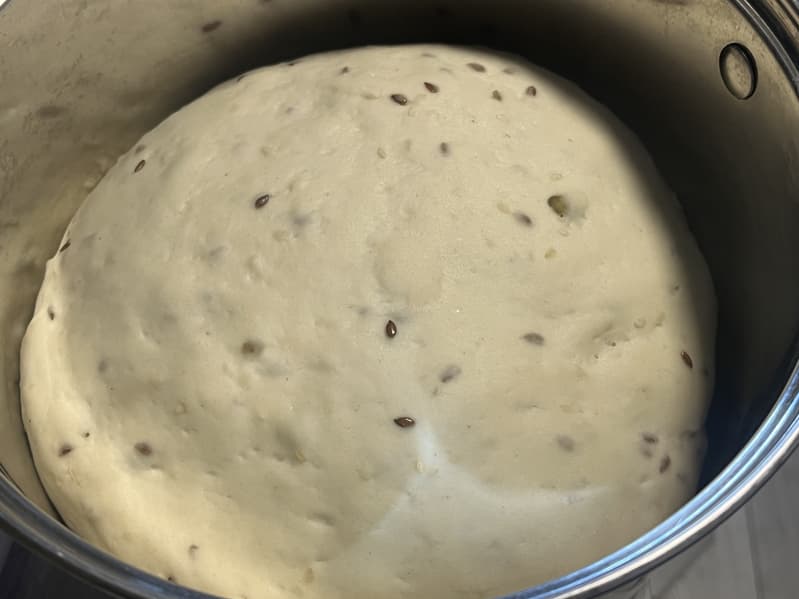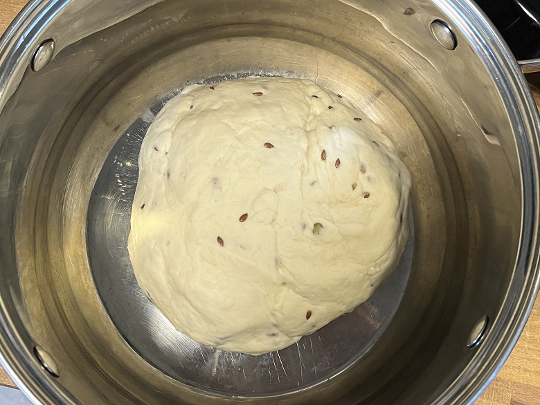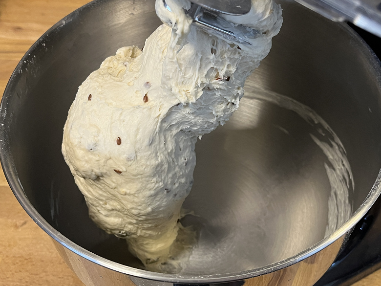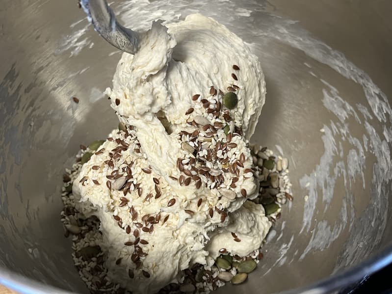 Через 2,5 минуты, когда тесто слегка замешалось, мы добавили к нему семена и отправили вымешиваться дальше.