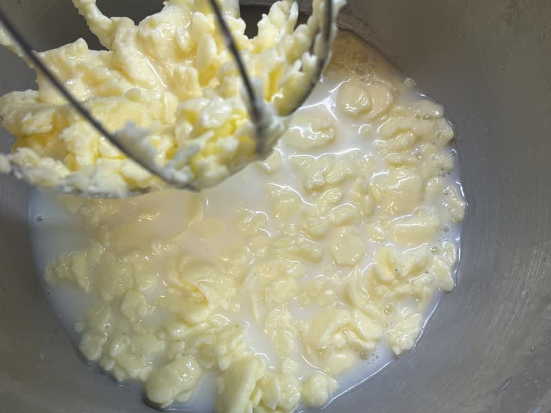 Продолжали взбивание сливок на 6-й скорости до тех пор, пока не начали образовываться комочки масла.