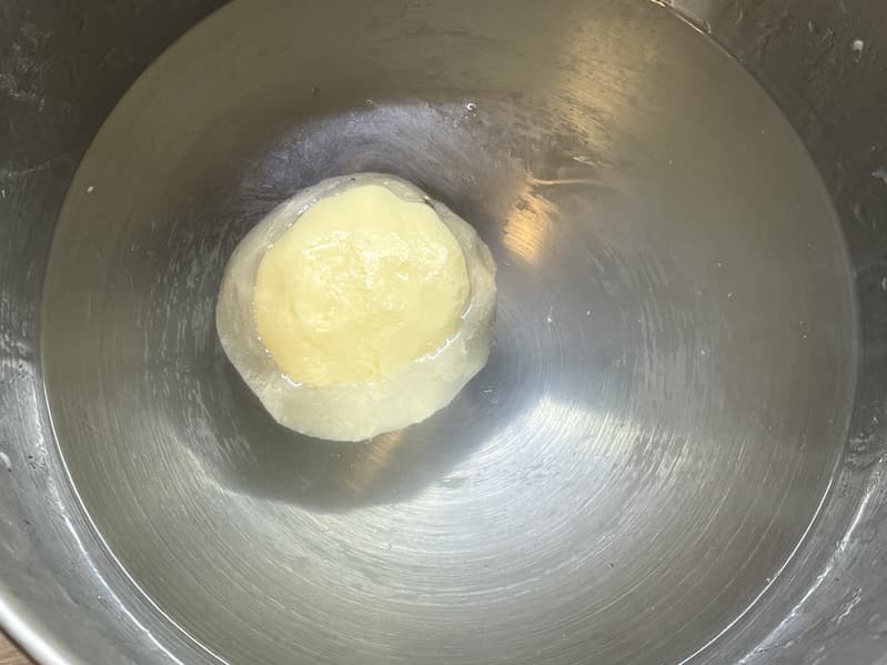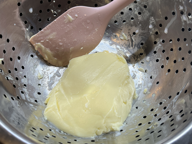 Далее сформировали руками шар, хорошенько промяли и отжали его, чтобы избавиться от остатков сыворотки, после чего поместили в ледяную воду и промывали масло, периодически меняя воду, пока она не стала прозрачной.