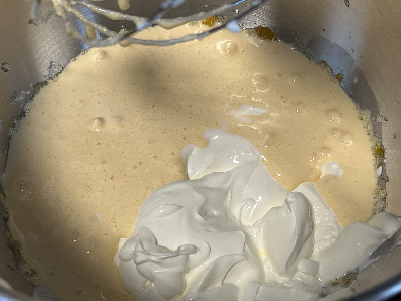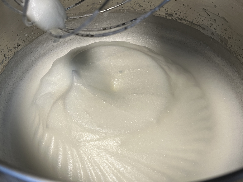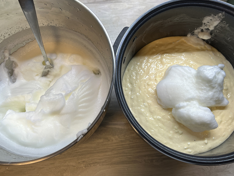 Освободили чашу от творожной смеси и наполнили ее белками. Взбили белки до густой белоснежной пены.