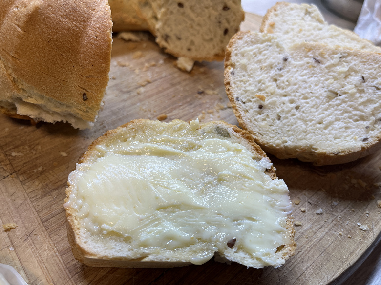Намазали на приготовленный нами хлеб приготовленное ранее масло и насладились вкусом двух отличных продуктов.