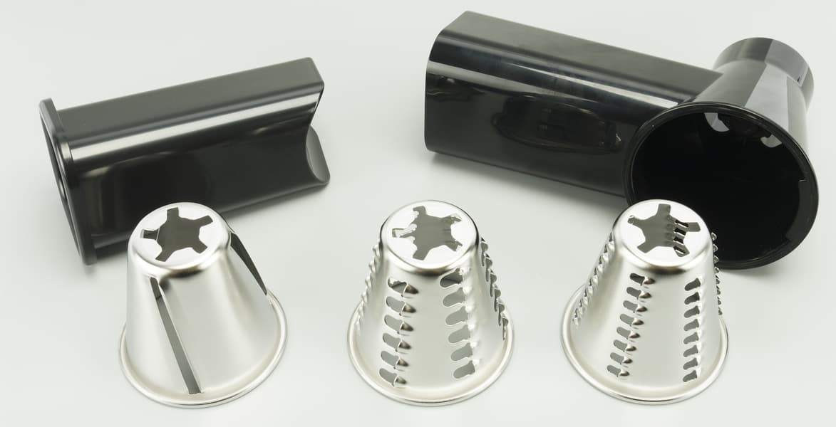 Конусообразные терки выполнены из металла. В комплекте: крупная терка, средняя и шинковка. В блок терки просто вставляются и цепляются в глубине небольшим поворотом за специальные выступы. Чтобы вынуть терку, надо чуть повернуть ее против часовой стрелки и потянуть на себя.