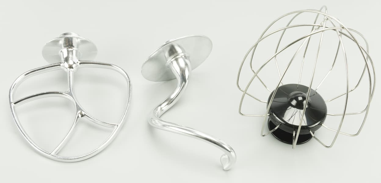 Комплект насадок для планетарного миксера состоит из венчика для взбивания, лопатки для смешивания и крюка для замешивания тугого теста. Крюк и лопатка целиком железные, а вот у венчика основание пластиковое.