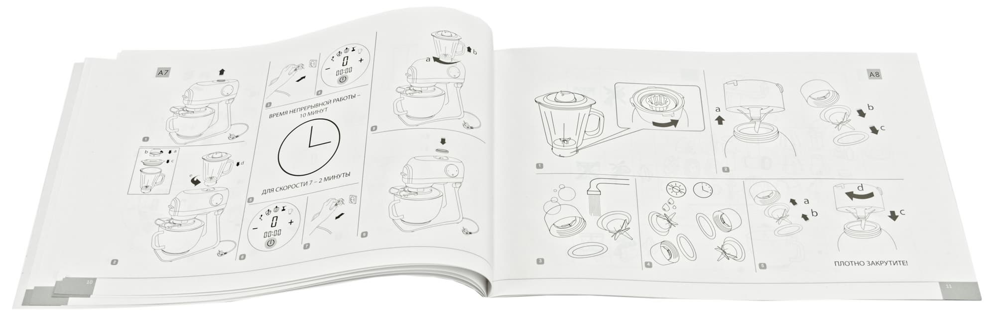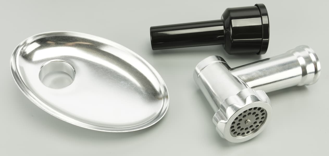 | Количество насадок | венчик для взбивания, крюк для замешивания теста, насадка для смешивания, мясорубка с 3 дисками из нержавеющей стали (3, 4 и 7 мм), насадка для кеббе, насадка для колбас, блендер (1,5 л) овощерезка (средняя и крупная терки, терка для шинкования) |