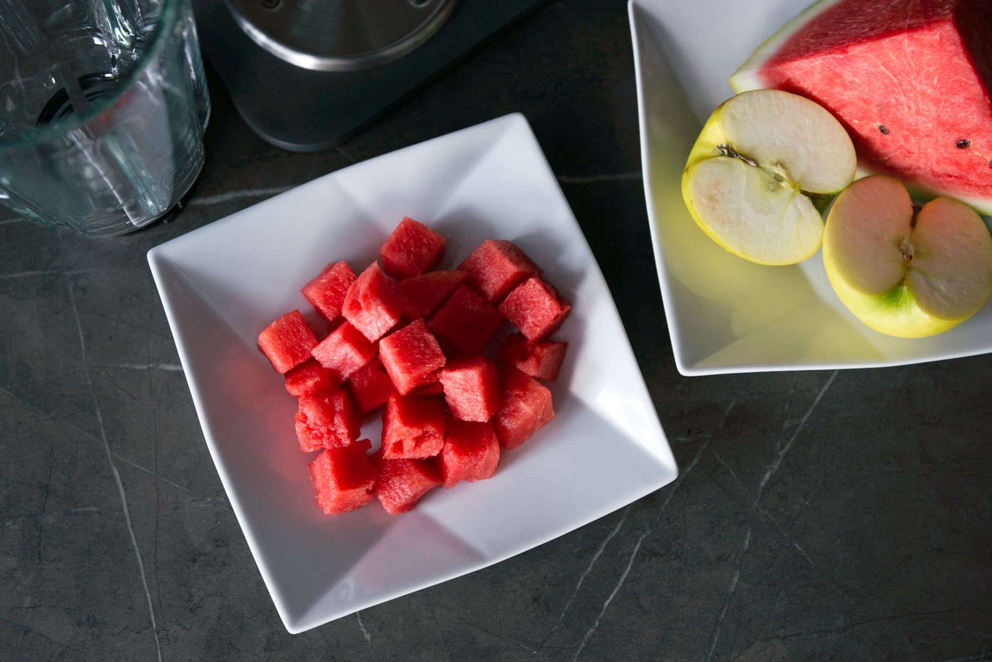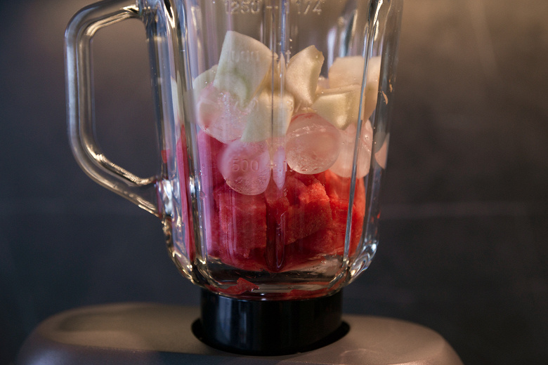В чашу блендера сложили арбуз, лед и кислое яблоко.