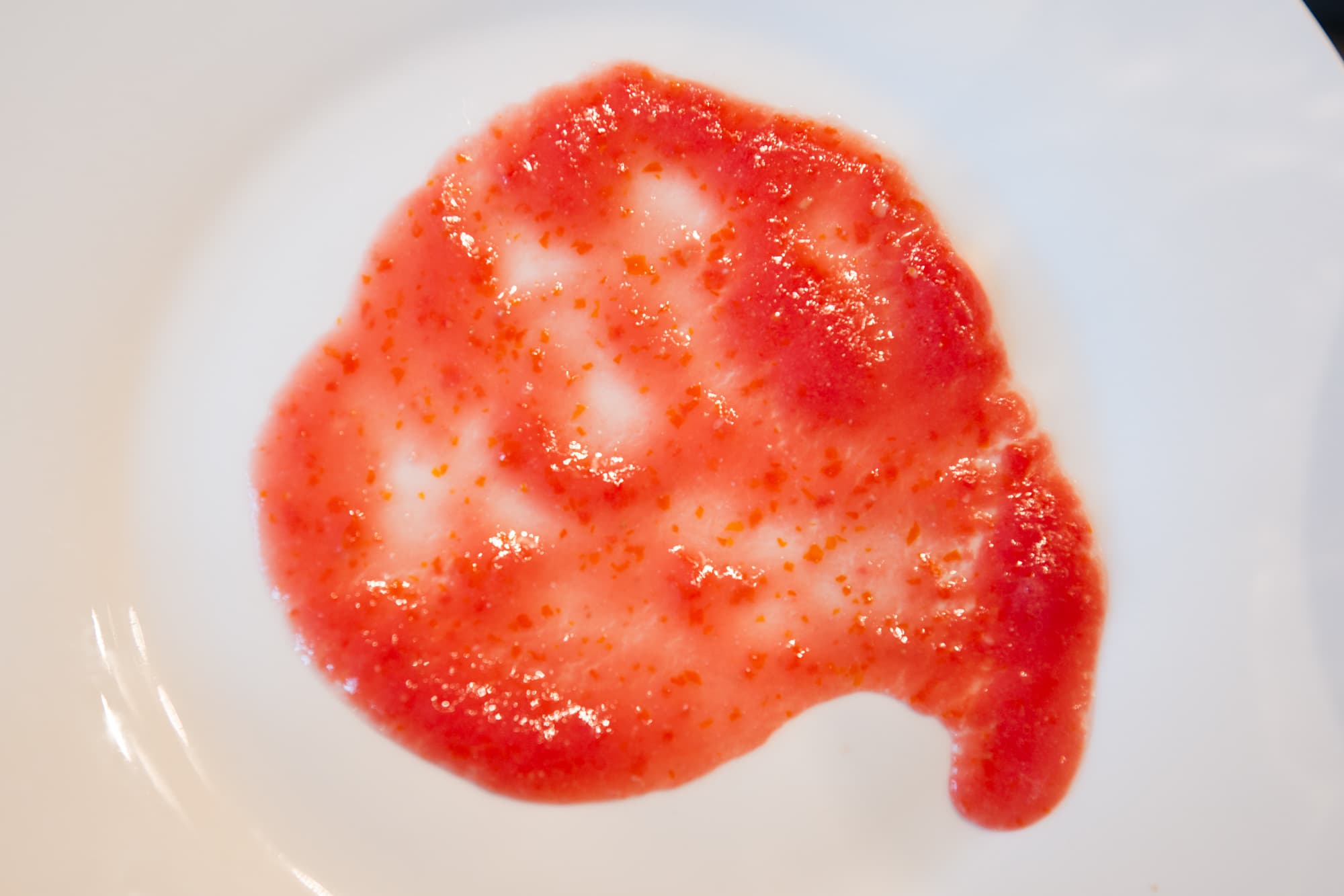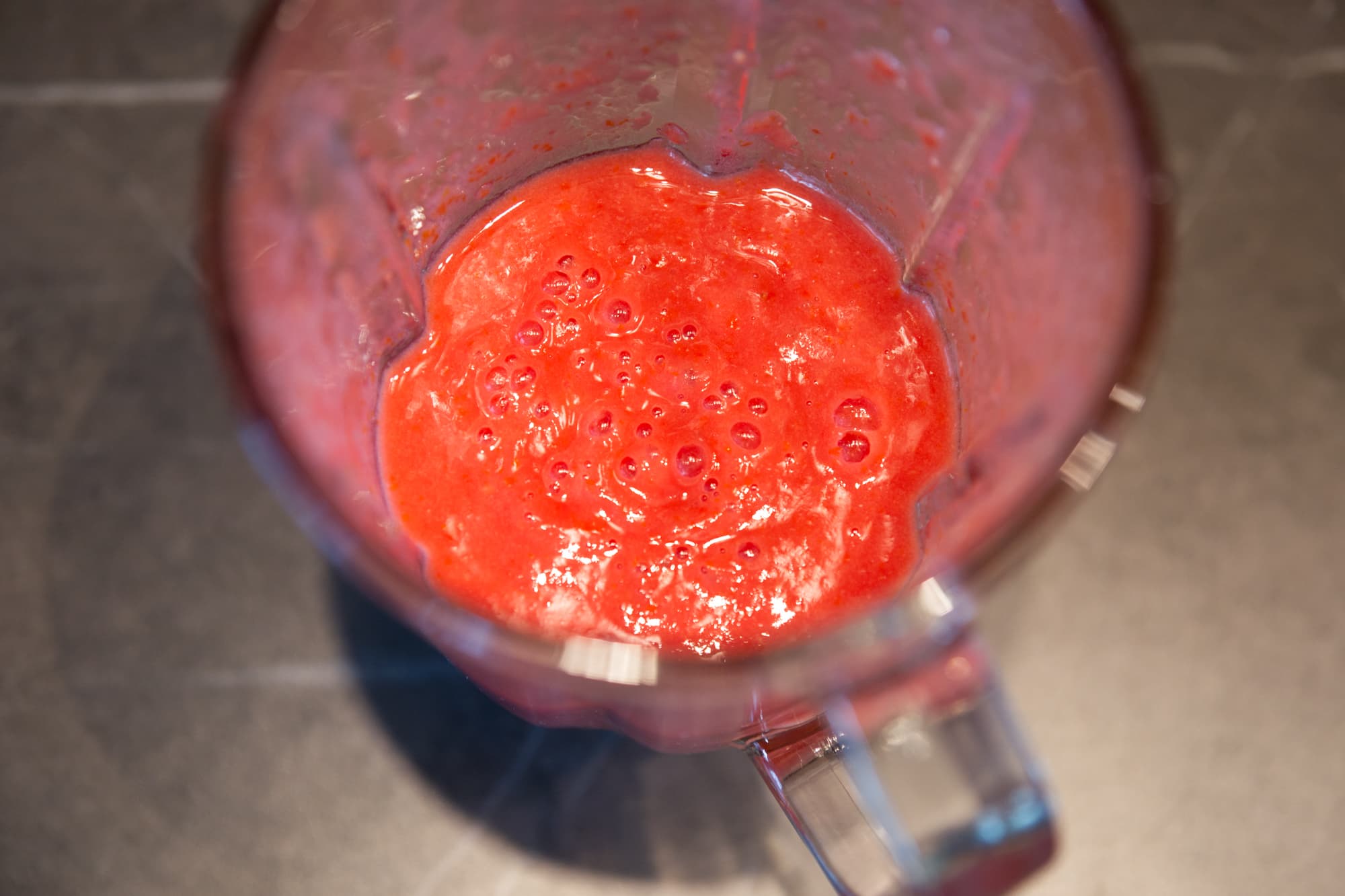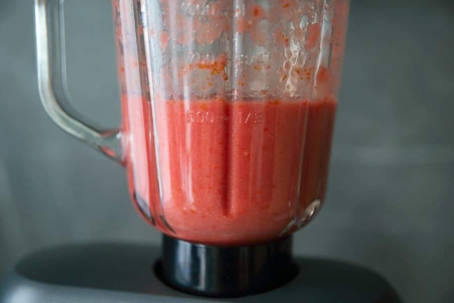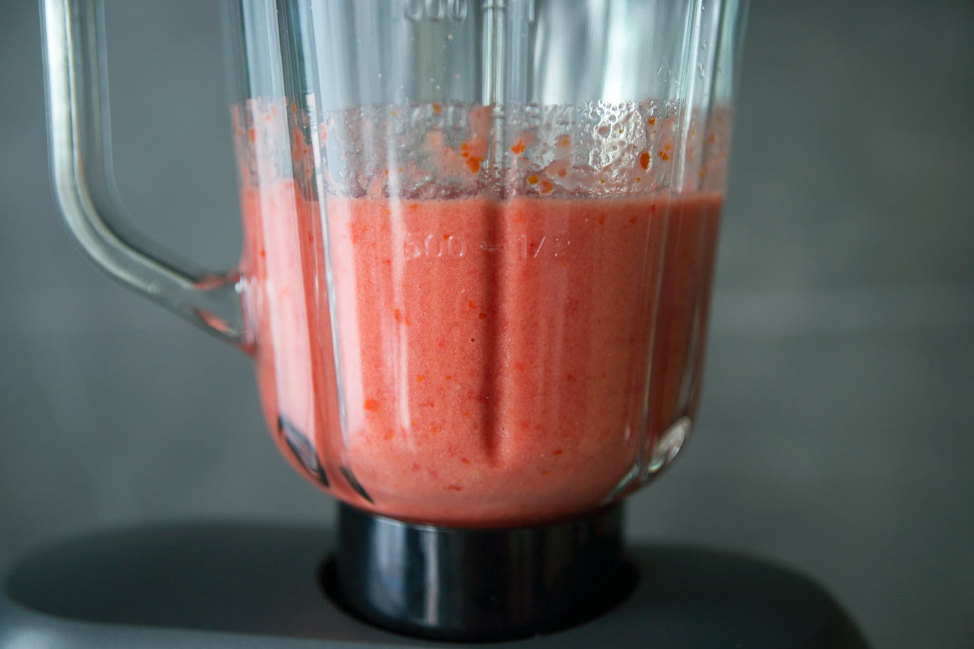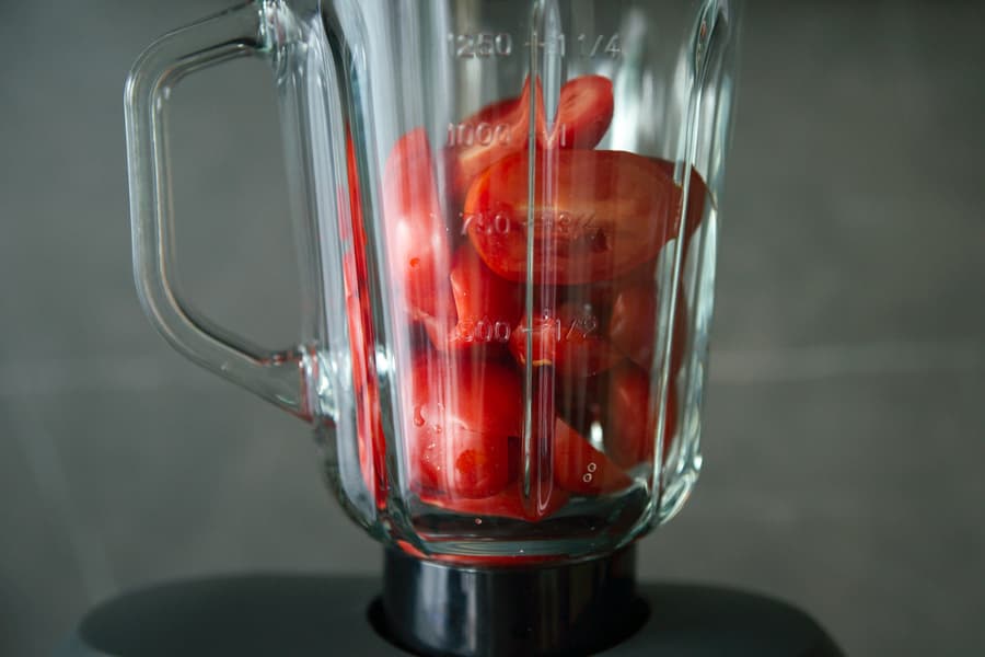 Ближе к 15-й секунде томаты уже превратились в однородную массу, но сквозь стекло блендера всё еще виднелись крупные кусочки, поэтому мы продолжили измельчение и еще через 15 секунд получили вот такой результат.