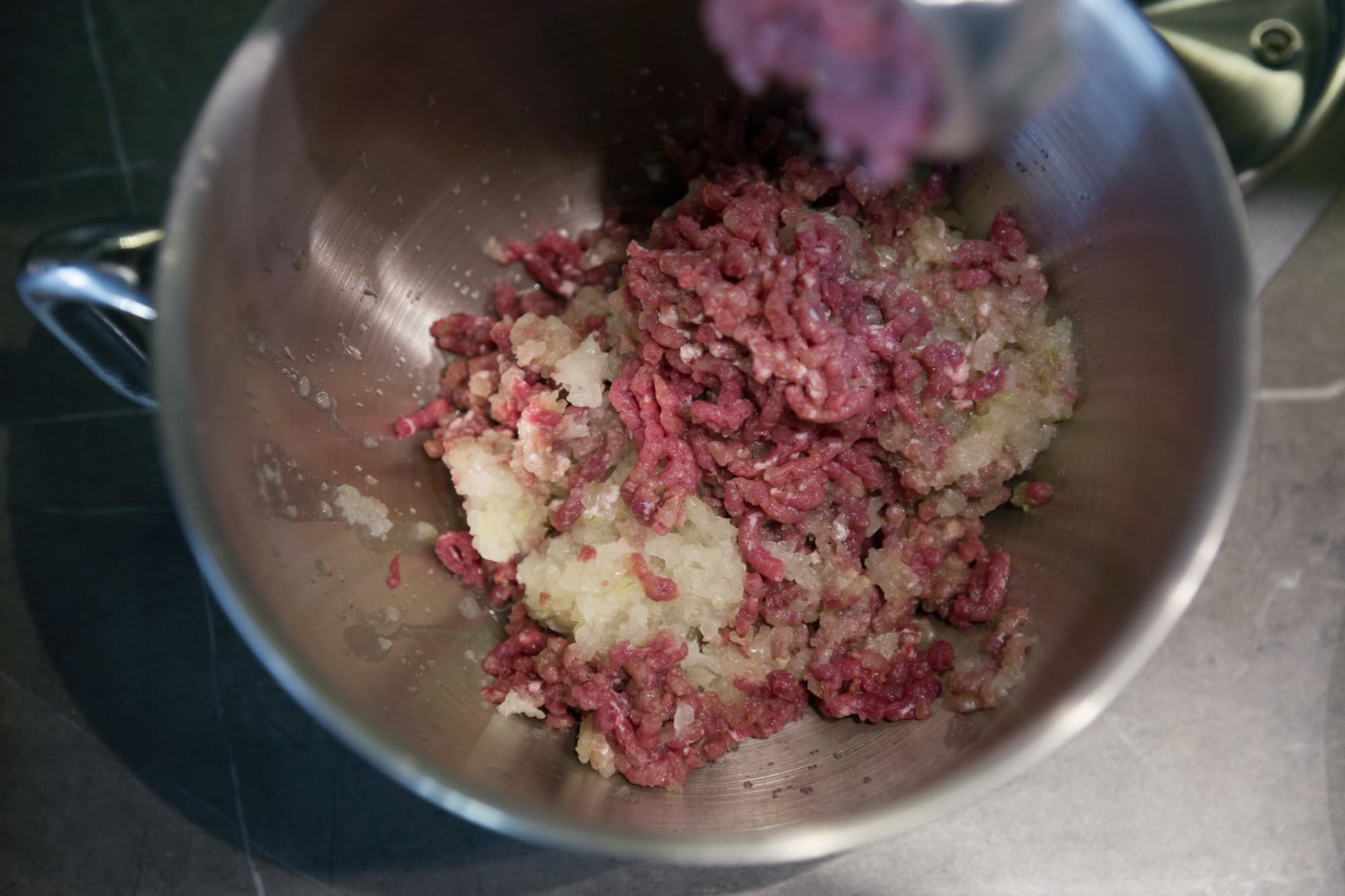Всего в емкости находилось 2 кг фарша. Такой объем был тщательно перемешан на 2-й скорости всего за пару минут.