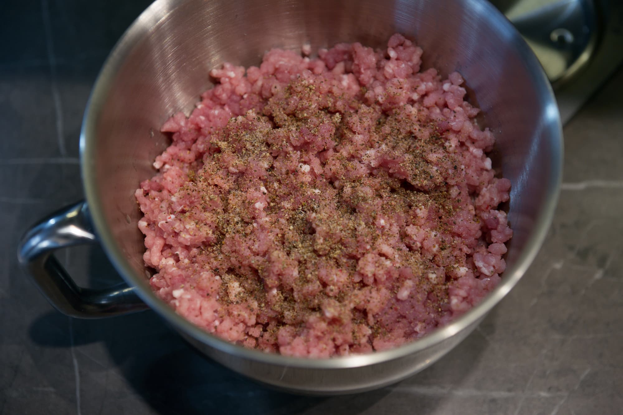 В чаше соединили оба фарша из предыдущих тестов, добавили молотый черный перец, соль и установили на моторный блок лопатку для смешивания.