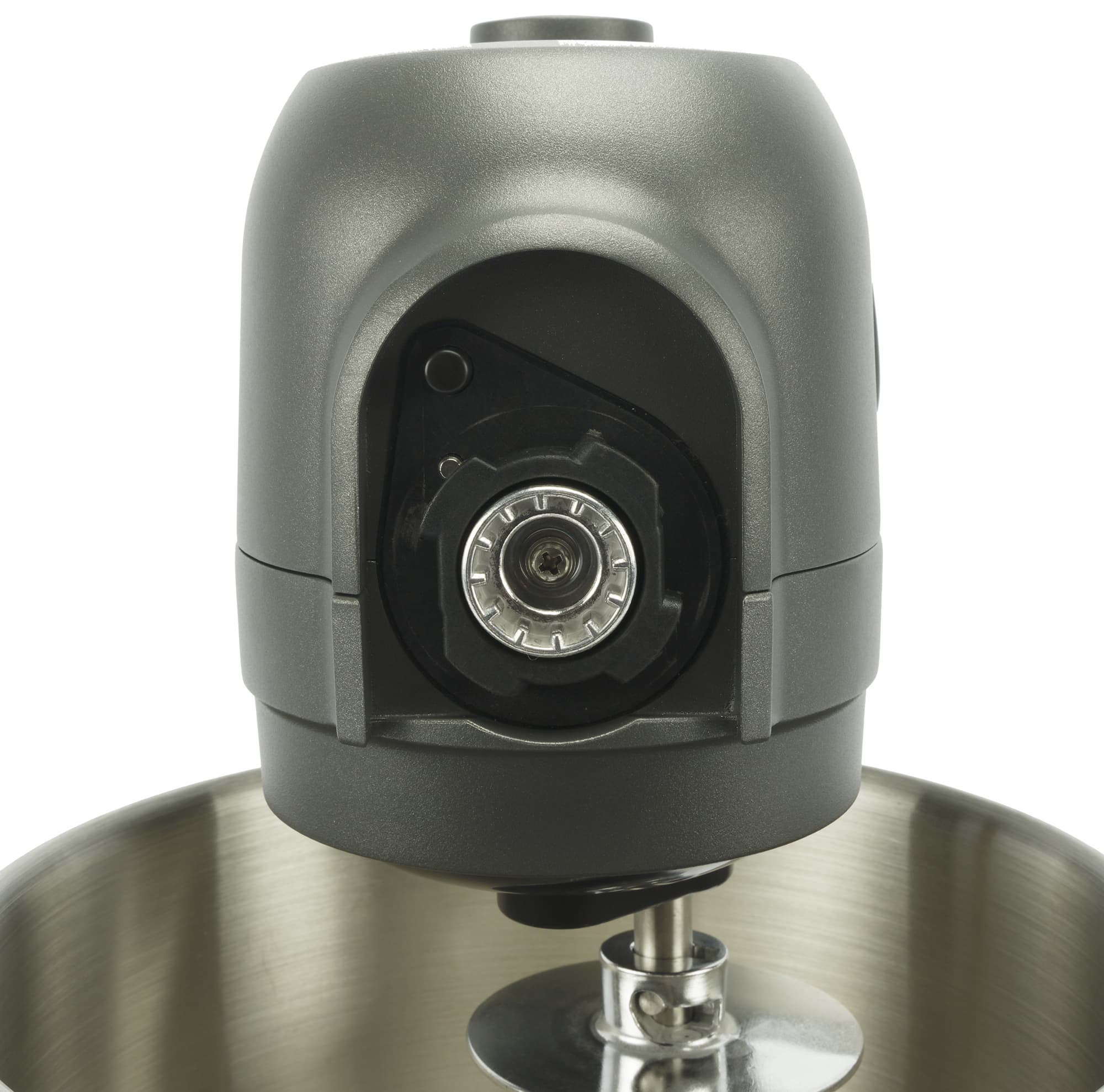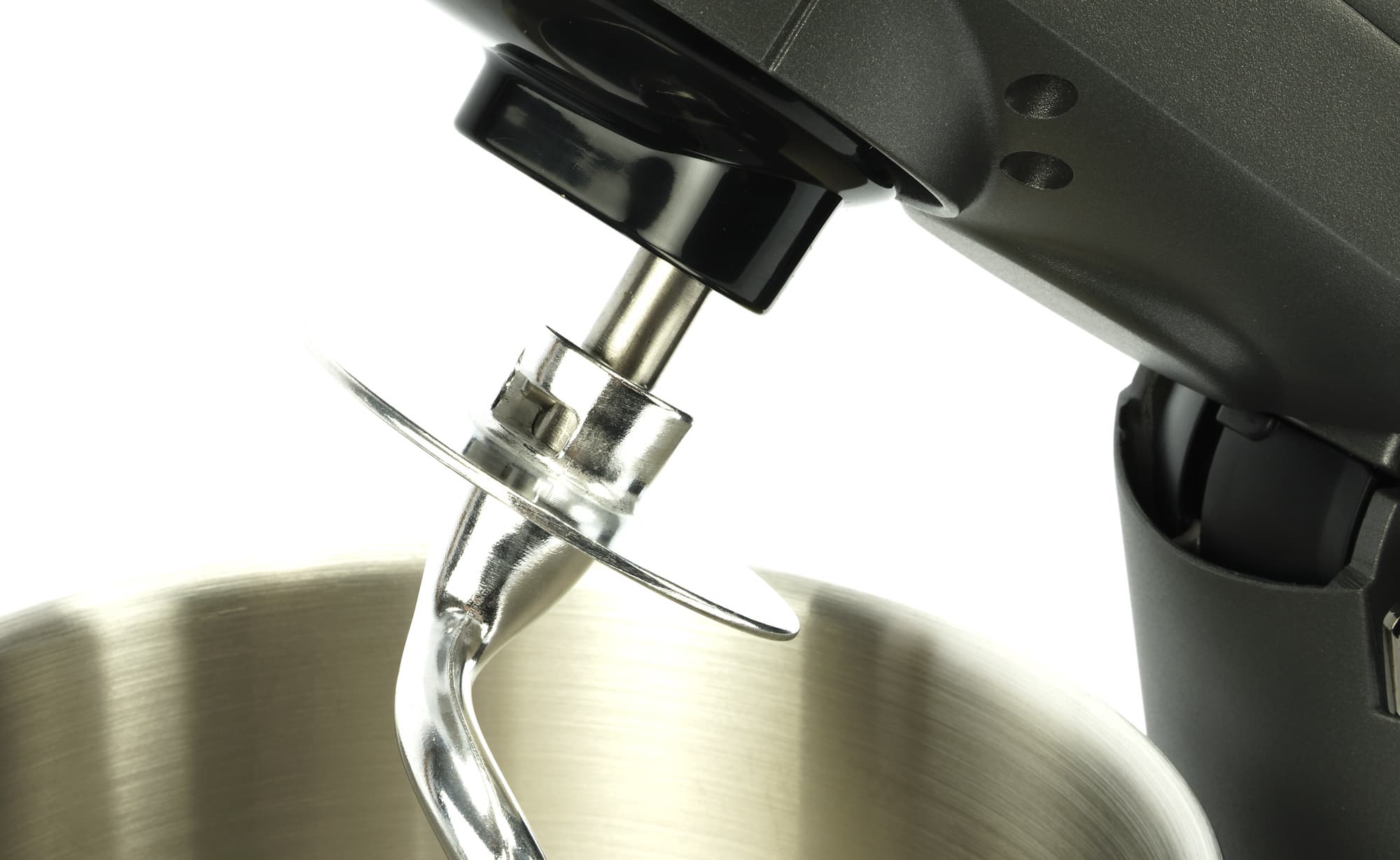 Конструкцию визуально облегчают обтекаемые формы и тонкая изогнутая ножка, соединяющая моторный блок с основанием, где находится углубление для установки дежи (чаши).