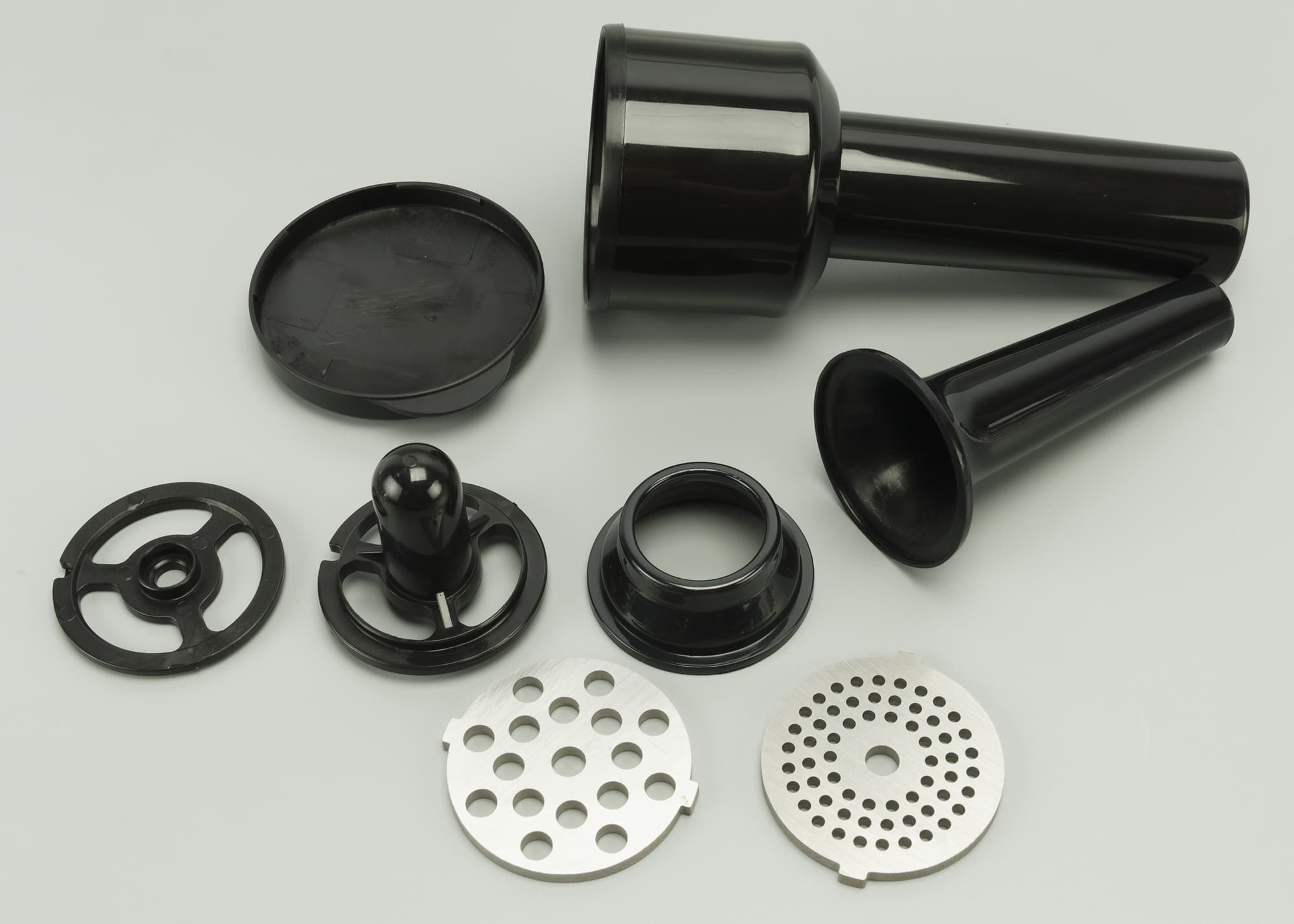 В комплекте прибора предусмотрены две запасных втулки для вала шнека. Корпус мясорубки выглядит стандартно: горловина, кольцевая гайка и шнек из алюминиевого сплава, нож и решетки — стальные.