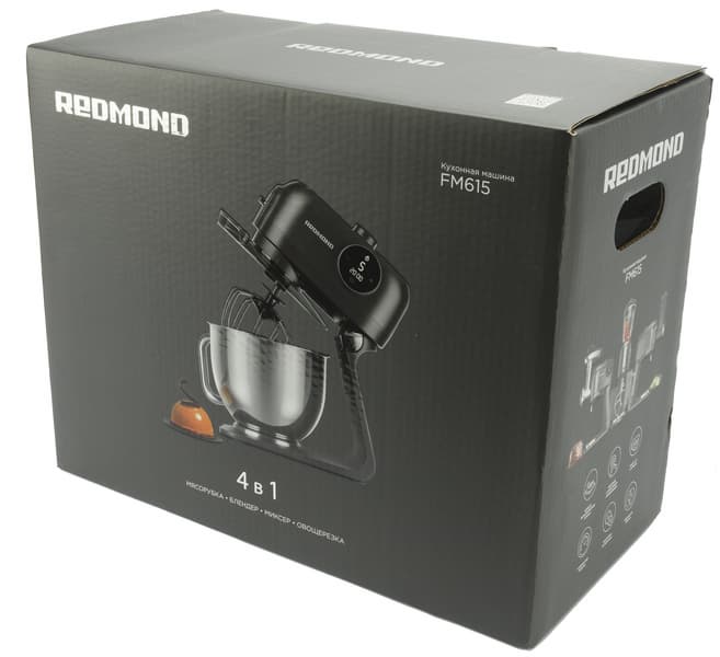 Кухонная машина Redmond FM615 поставляется в большой коробке, оформленной в фирменной стилистике бренда. На матовом фоне графитового оттенка глянцевой ламинацией выделены фотографии устройства в сборке со всеми насадками, на боковых гранях размещена информация об особенностях прибора, а рядом приведены краткие технические характеристики и сведения о производителе.