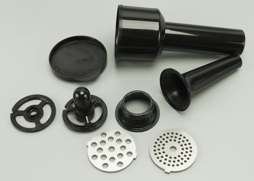 Толкатель пластиковый, как и аксессуары: насадка для изготовления колбас и кеббе. Диаметр отверстия насадки для колбасок на выходе — 1,7 см. Корпус толкателя одновременно служит и контейнером для хранения мелких деталей.