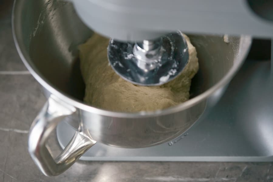Начали с первой скорости и постепенно перешли на вторую. Крюк собрал содержимое чаши в плотный эластичный комок довольно быстро, всего за пару минут. Только один раз нам пришлось приостановить работу комбайна, чтобы собрать лопаткой муку, налипшую на стенки чаши — к слову, ее было совсем немного. Еще через 3 минуты комок теста уже не лип к рукам и легко отходил от стенок емкости.