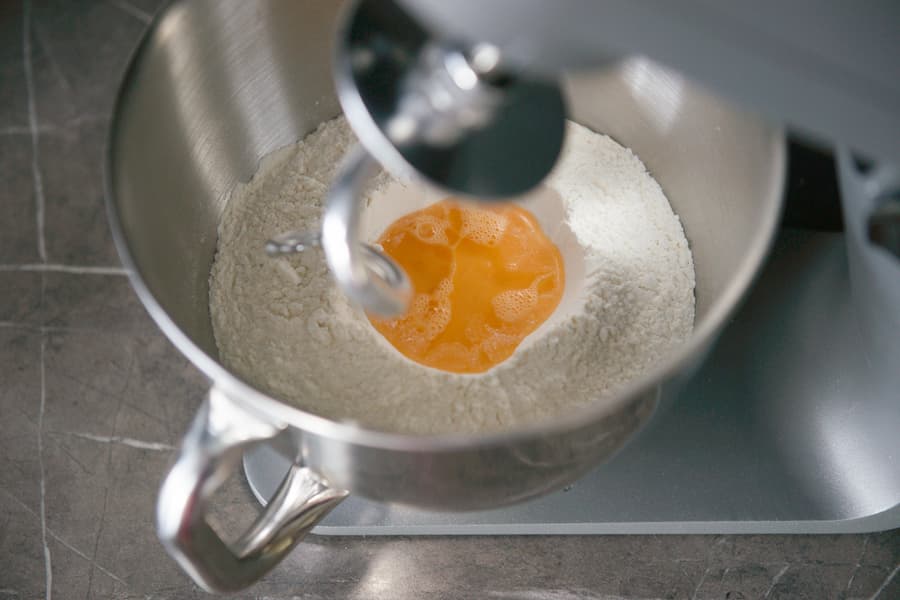 Поменяли лопатку на насадку в виде крюка, в чашу просеяли 700 г муки, в углубление в центре влили 90 г яиц, всыпали 10 г соли, столовую ложку растительного масла и 300 мл воды комнатной температуры.