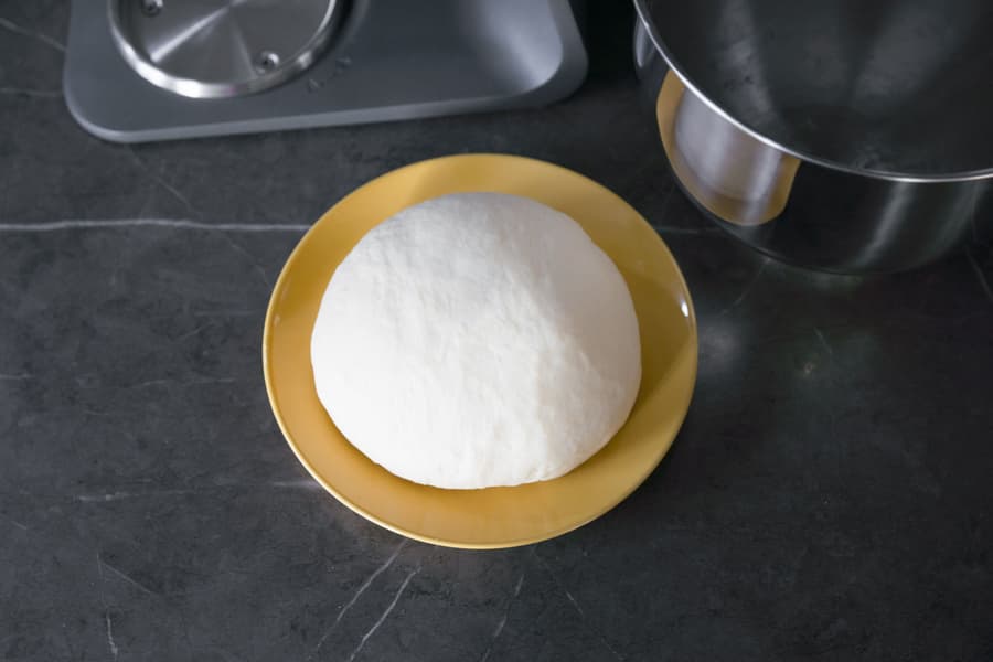 Мы остановили прибор, сняли тесто с крюка и переложили его на тарелку.