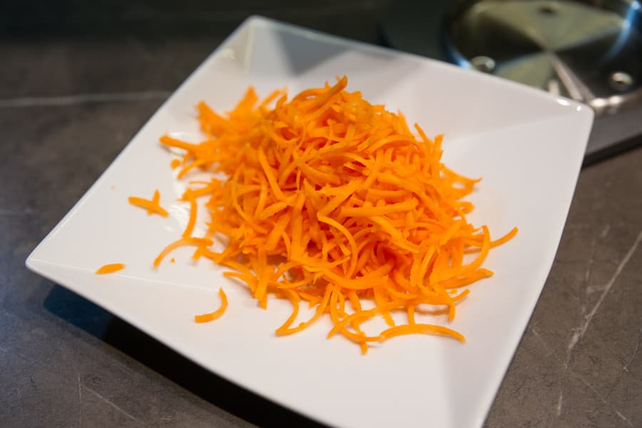 Следующей в горловину отправилась морковь. Также на средней терке. И снова всё ровно, аккуратно и красиво.
