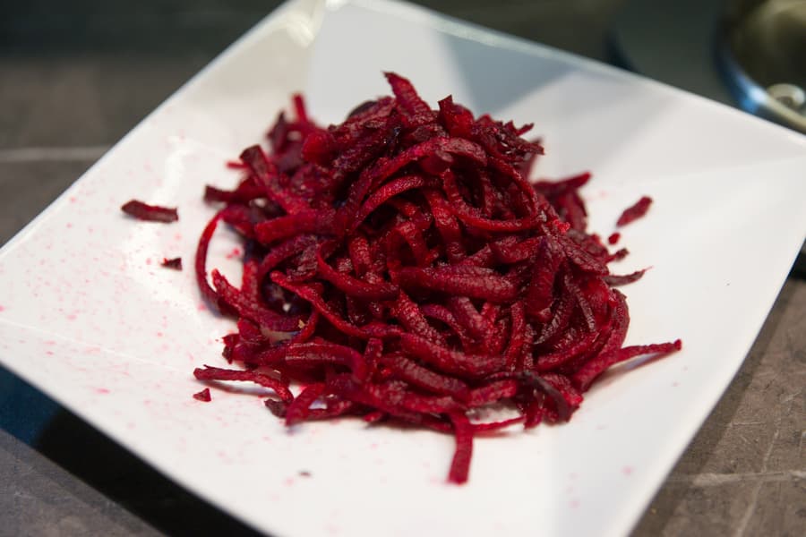 В этом тесте комбайн работал на пятой, рекомендуемой для овощерезки скорости. Начали со свеклы. Небольшие корнеплоды пришлось нарезать на две, а некоторые — на четыре части. Сначала мы опробовали крупную терку. Машина легко измельчила твердые овощи и выдала ювелирную стружку. 100 г были обработаны за 30 секунд.