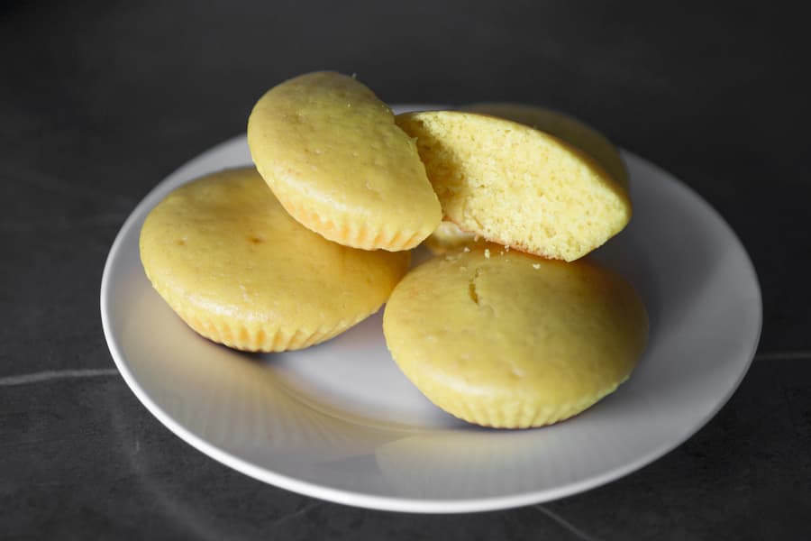 Тесто разлили по формочкам и отправили в разогретую до 190 градусов духовку на 20 минут. Бисквит получился нежным и воздушным.