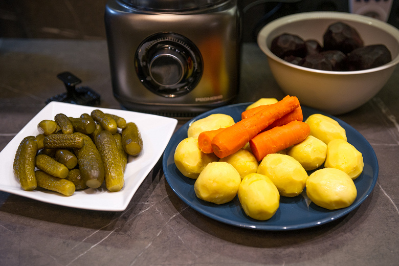 Для проверки насадки, режущей кубиками, мы подготовили вареные картофель, морковь и свеклу, маринованные огурцы и секундомер. Овощи не пришлось нарезать, среднего размера корнеплоды легко проходили в горловину, поэтому мы просто включили максимальную скорость и закидывали продукты внутрь один за другим.