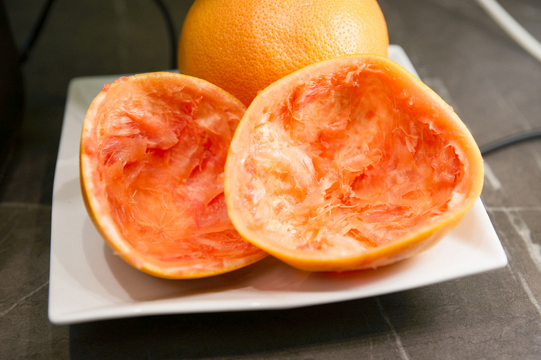 Крупный грейпфрут весом почти 600 г разрезали пополам, установили необходимую насадку на чашу, включили минимальную скорость и надели на отжимную головку половину фрукта. Мы надавливали на грейпфрут, насадка довольно быстро вращалась и выдавливала сок из мякоти. Фрукт был крупным, поэтому под конец половинку приходилось прижимать к насадке с силой. Соковыжималка самостоятельно отключилась ровно через 2 минуты, как и заявлено в инструкции, а мы не стали добавлять время, так как обнаружили, что сок выжат полностью. По инструкции, до следующего запуска прибору требуется перерыв на 10 минут, но если включить его сразу после отключения, он работает.