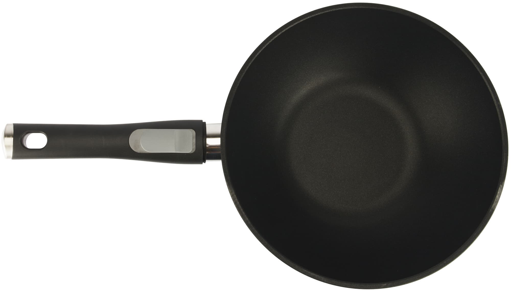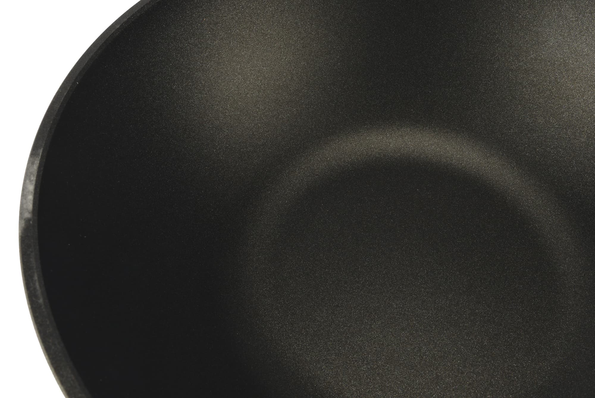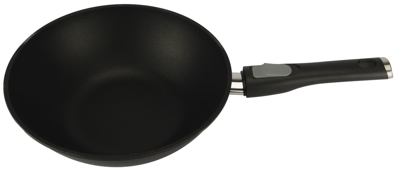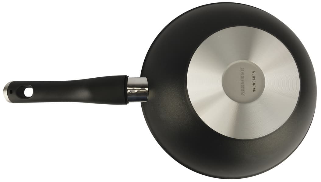 Диаметр дна сковороды значительно меньше диаметра верха, что и определяет особенности техники быстрой обжарки stir-fry, распространенной среди блюд азиатской кухни. Антипригарное покрытие нанесено ровным слоем, оно гладкое и производит впечатление долговечного при должном бережном уходе.