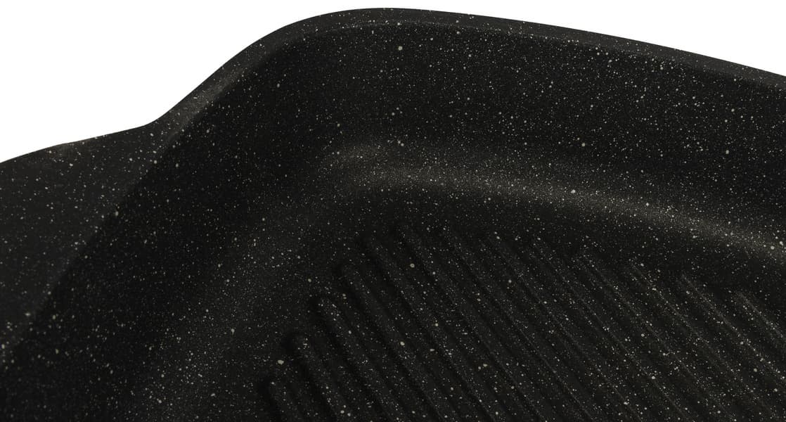 Индукционная сковорода-гриль Redmond PF5504, как и посуда из предыдущей статьи, относится к серии Black&Stone, что исчерпывающе описывает ее внешний вид. Снаружи поверхность глубокого черного цвета с мерцающими вкраплениями. Внутри покрытие черное с мелкими светлыми точками.