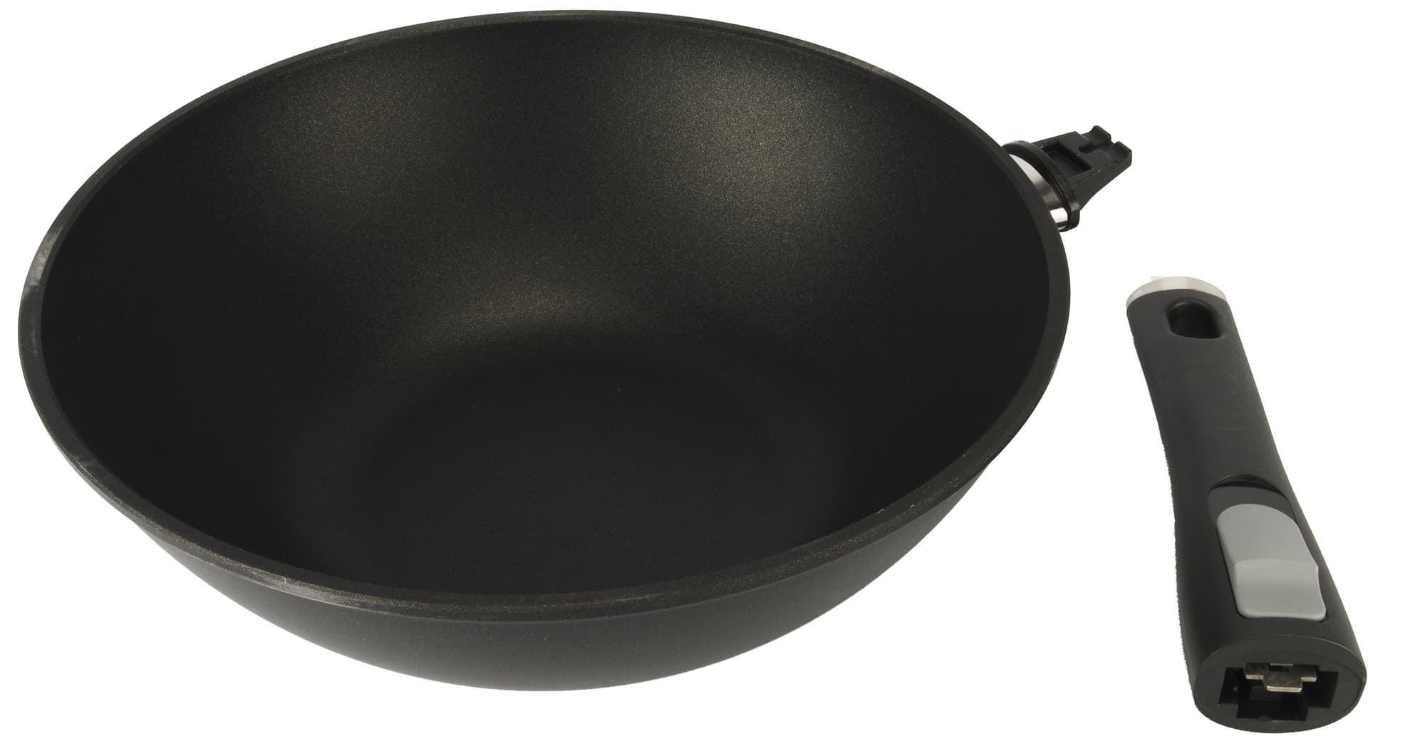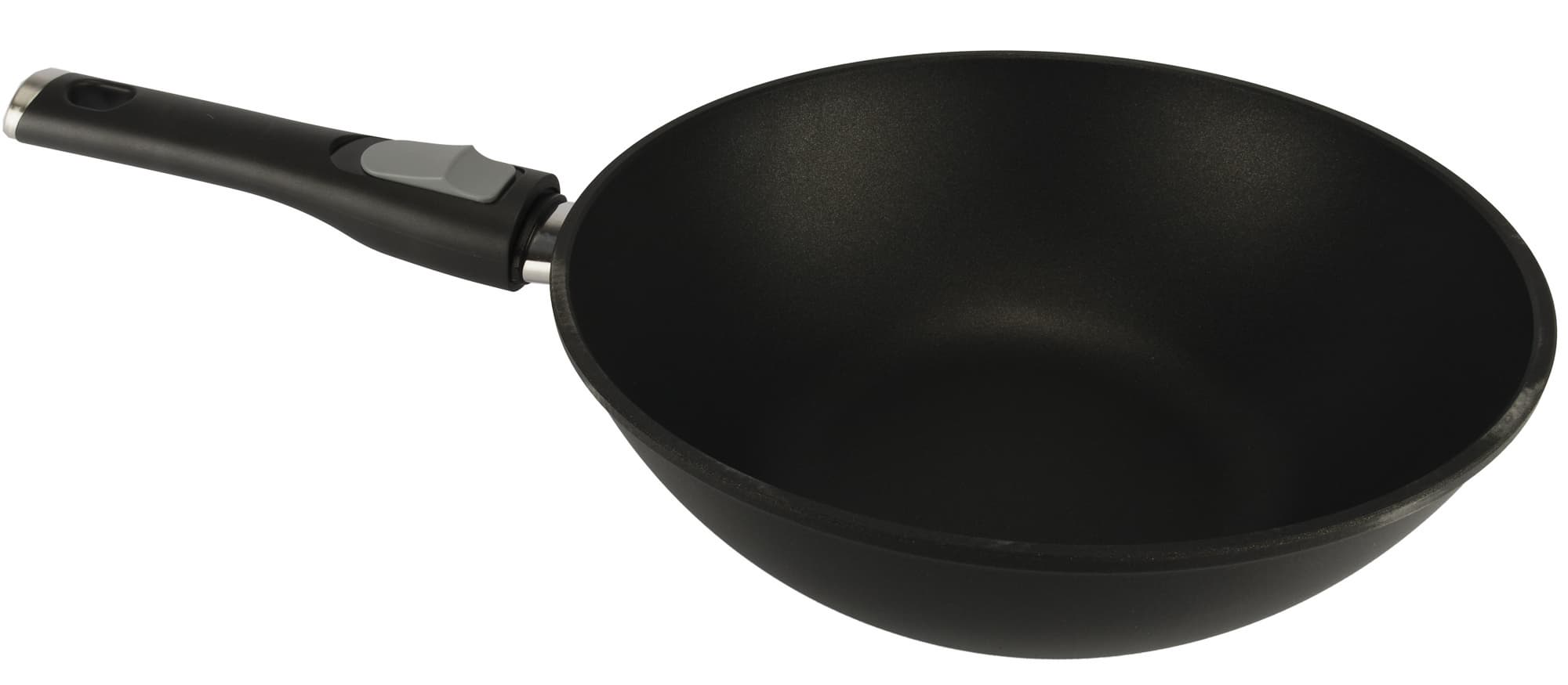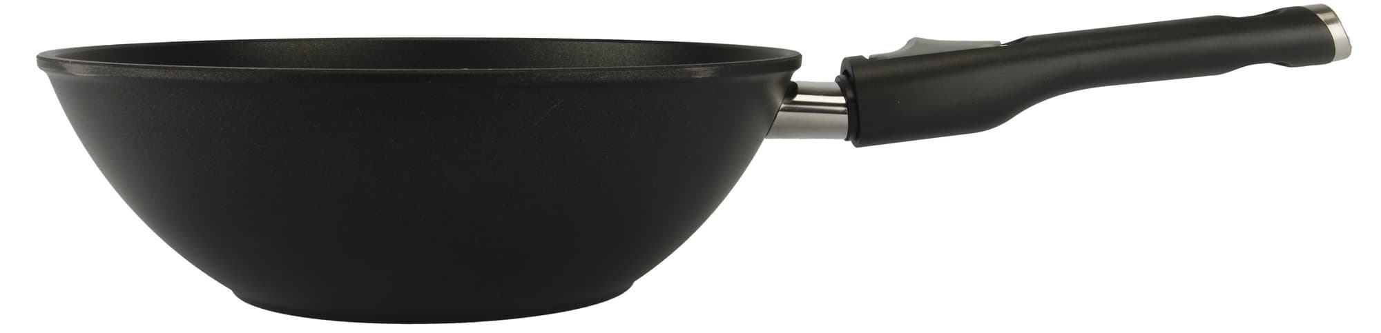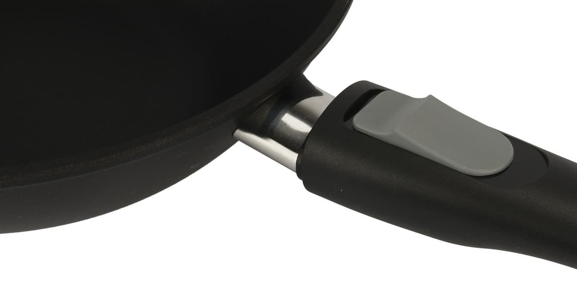 Ручка фиксируется и снимается интуитивно понятным образом. Держит сковороду надежно, крепление производит впечатление прочного и того, которое не разболтается со временем.