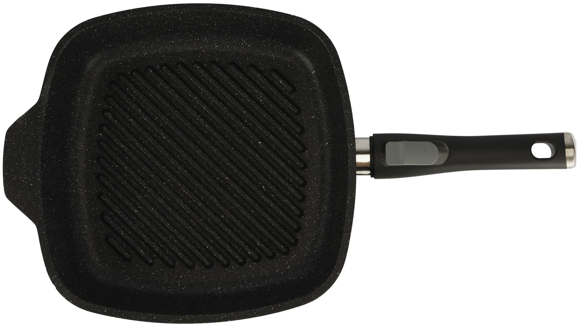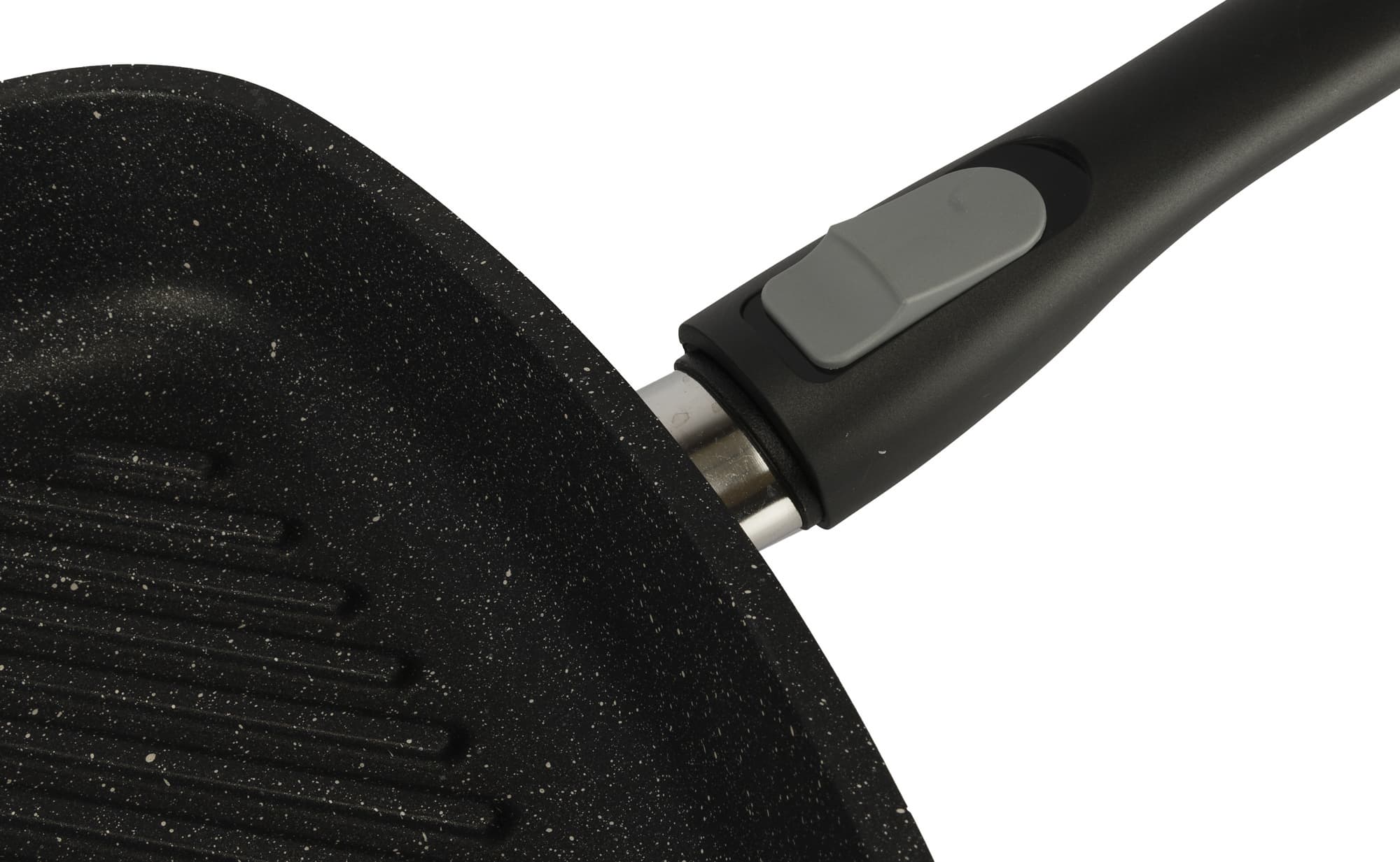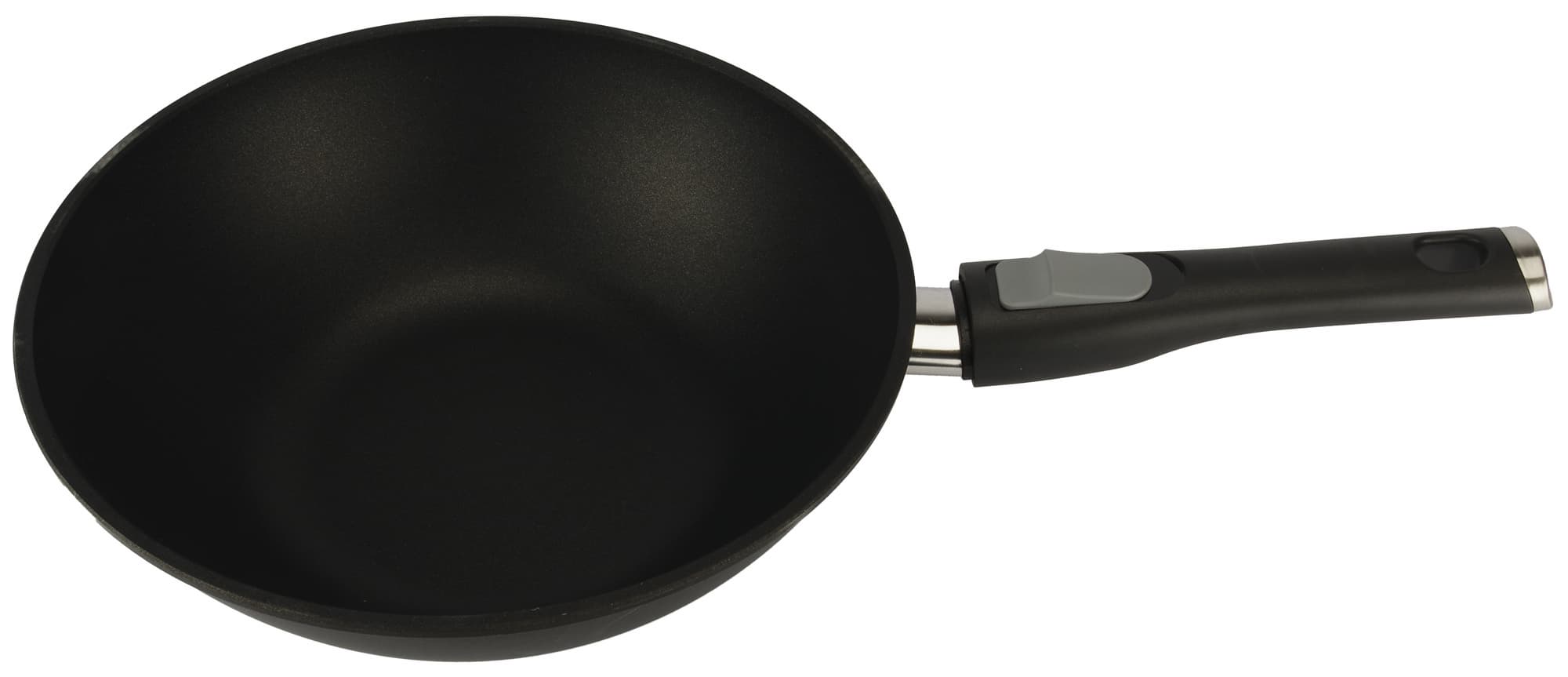Ручка фиксируется и снимается интуитивно понятным образом. Держит сковороду надежно, крепление производит впечатление прочного и того, которое не разболтается со временем.