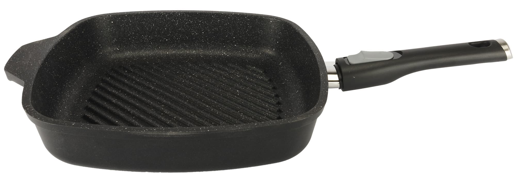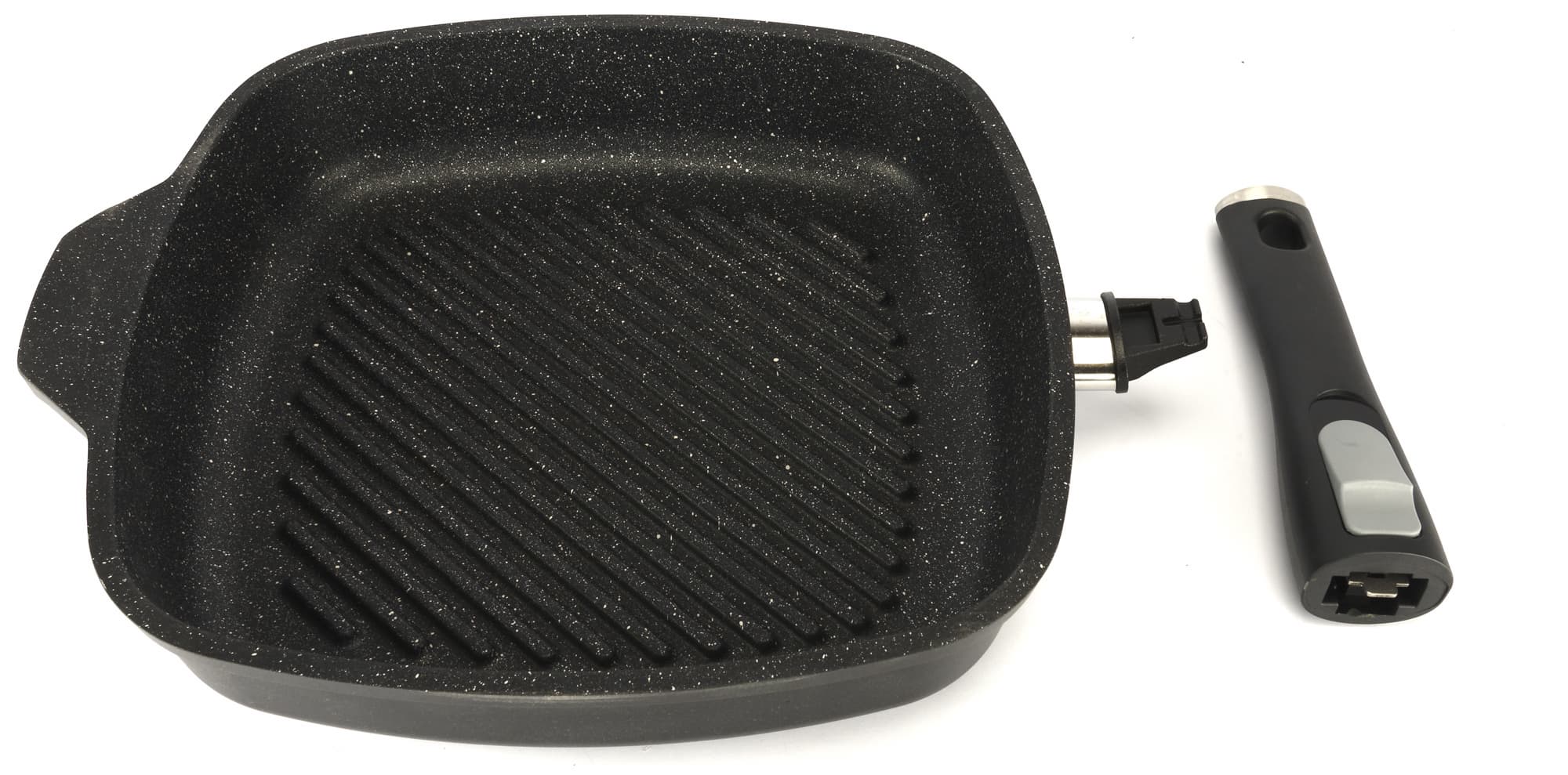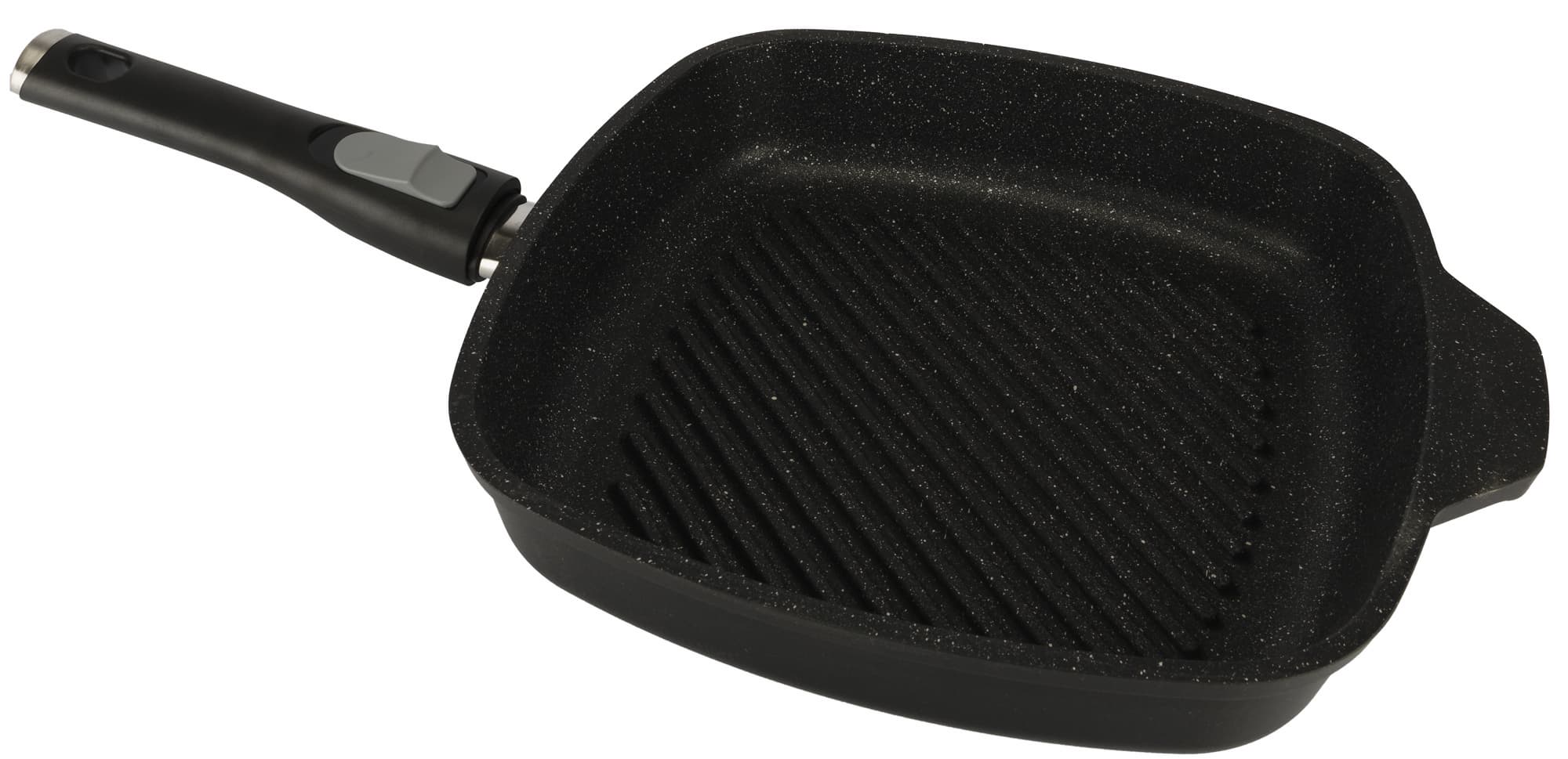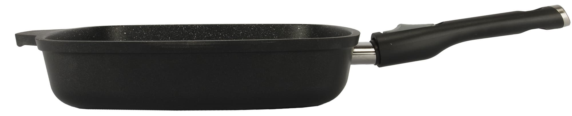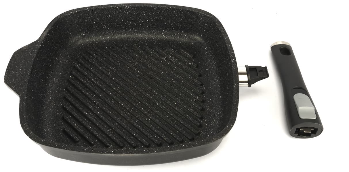 Форма квадратная со скругленными углами. Сковорода тяжелая — весит два килограмма, изготовлена из литого алюминия. Ручка съемная, бакелитовая.