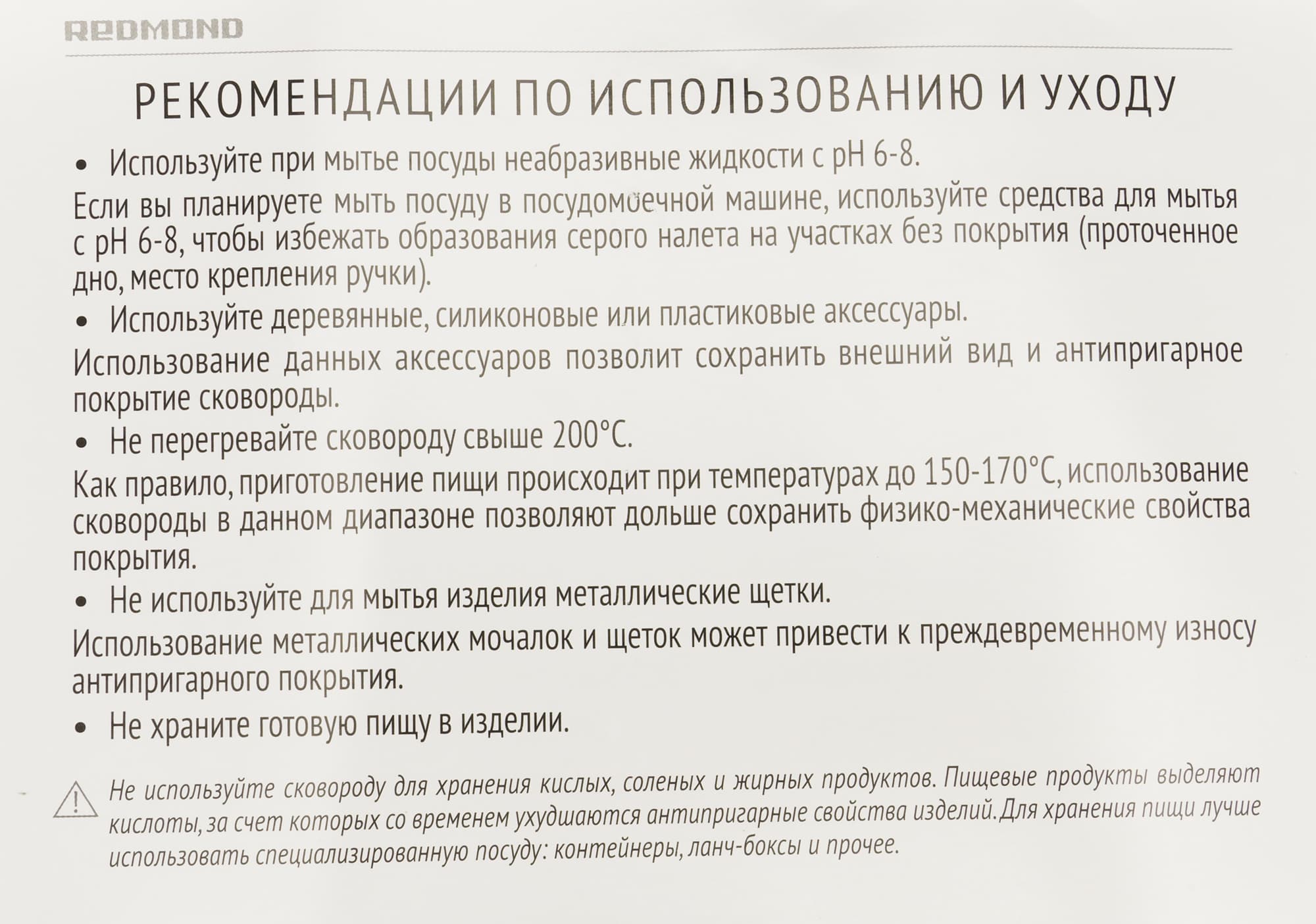 - Производитель все также рекомендует перекладывать остатки приготовленной пищи в специальную посуду или контейнеры для предотвращения окисления поверхности сковороды.