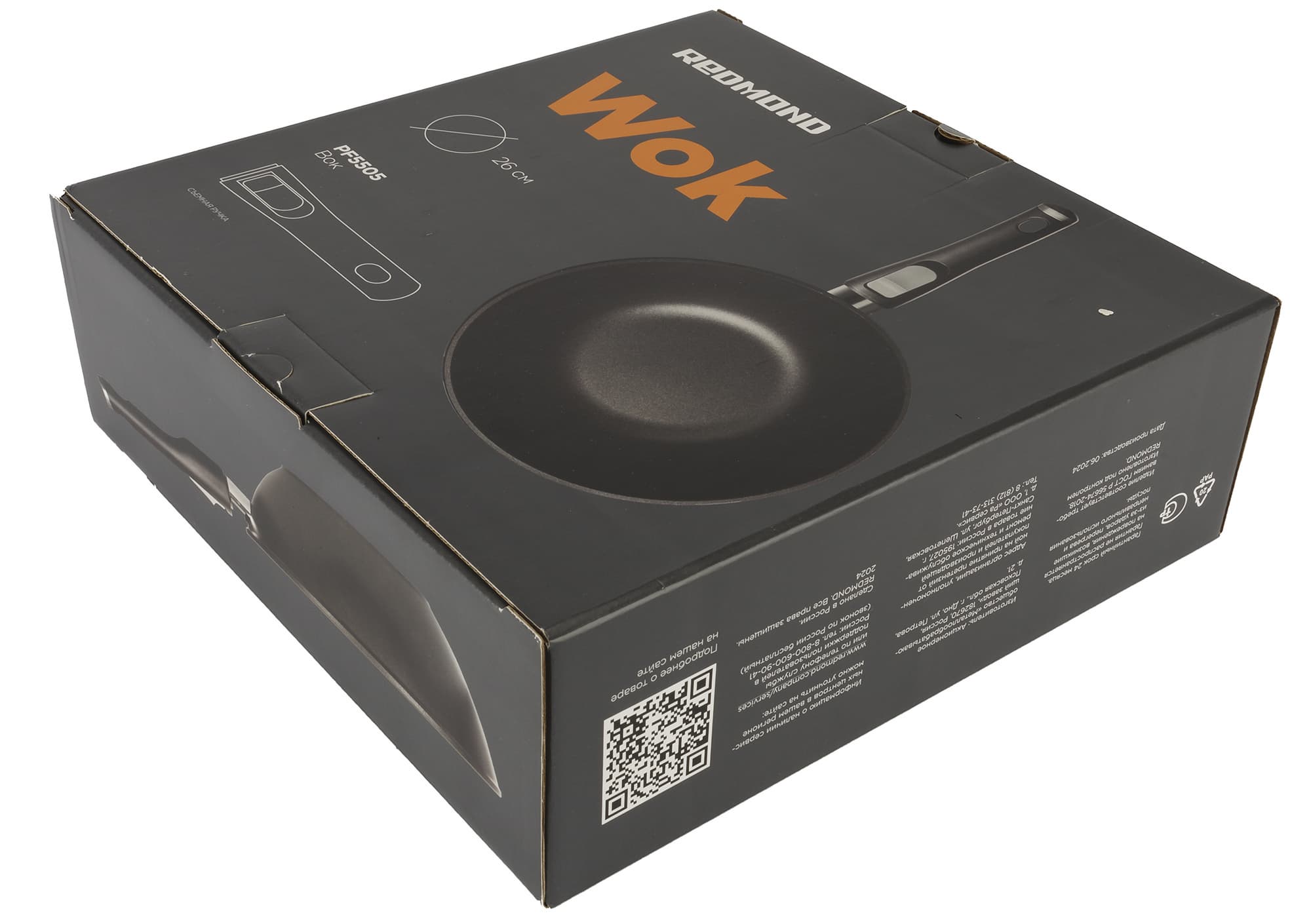 В отличие от посуды серии Classic Induction, вок поставляется в коробке серого цвета. На ней мы видим фотографию сковороды, ее название и модель. На боковых сторонах приведена информация о производителе и его реквизитах, а также перечислены достоинства и особенности именно этого изделия «Редмонд».