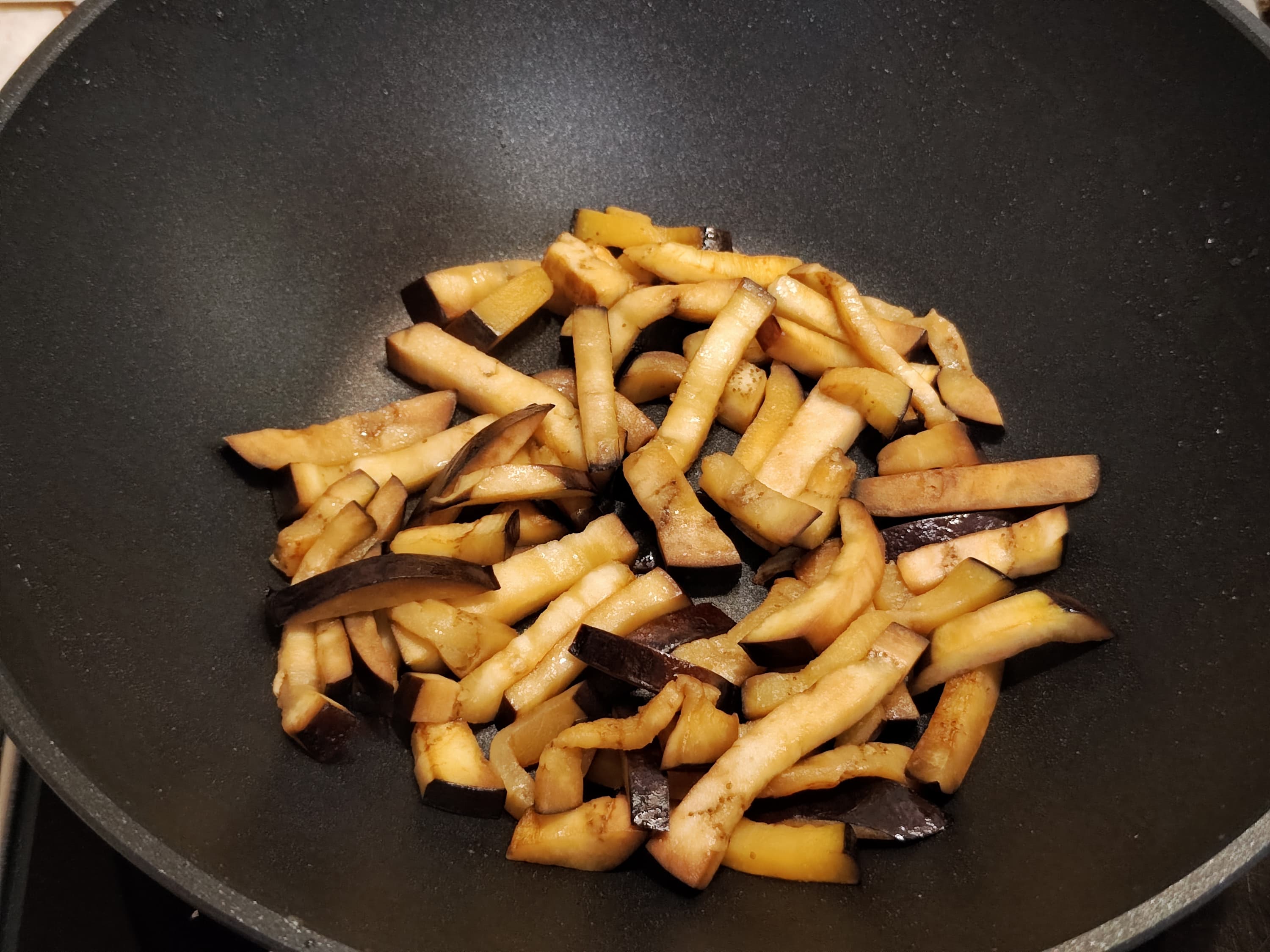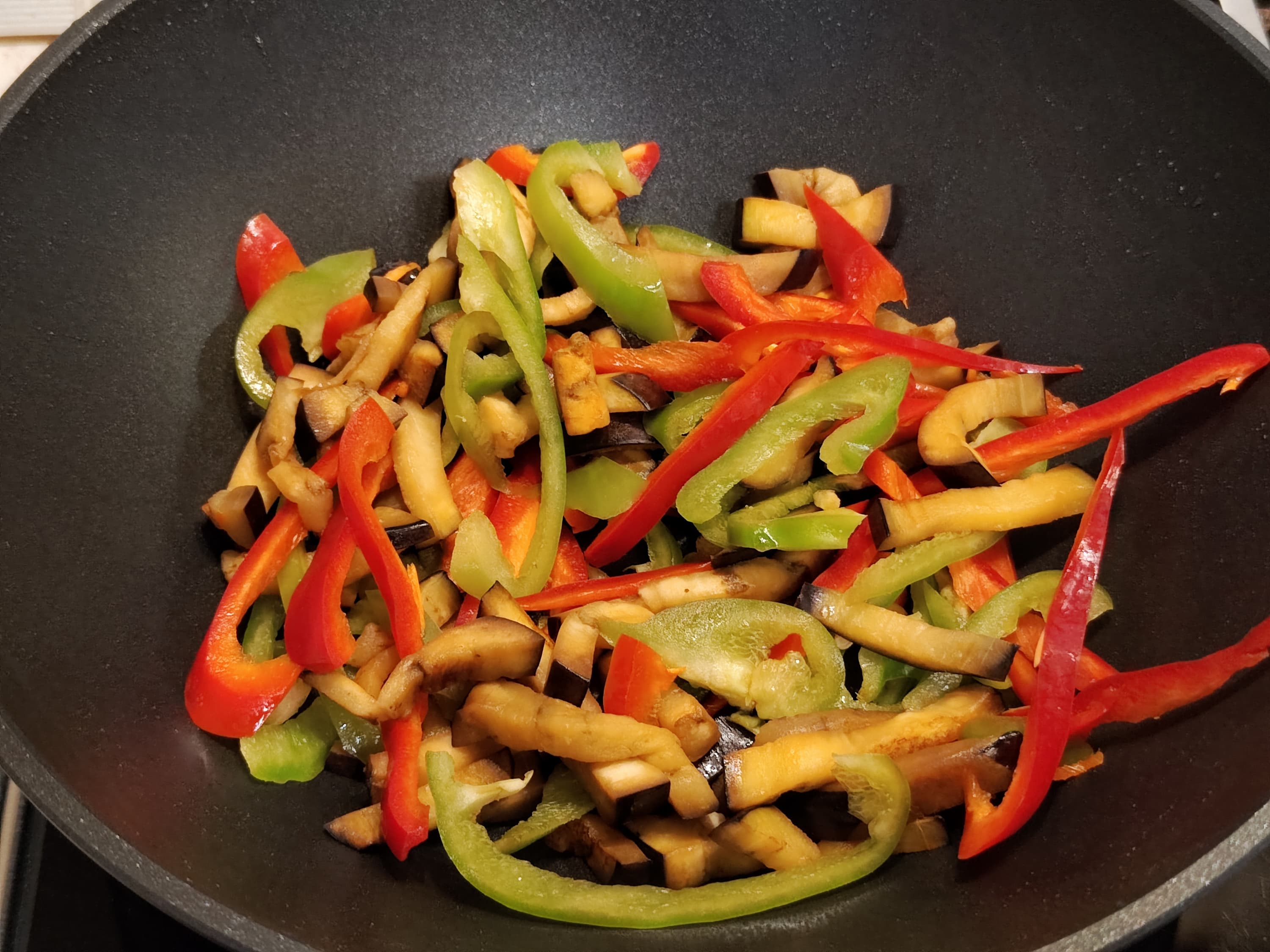 После того, как овощи размягчились и слегка поджарились, выложили их в миску, долили немного масла и положили в сковородку баклажан, нарезанный соломкой. Через несколько минут добавили болгарский перец.