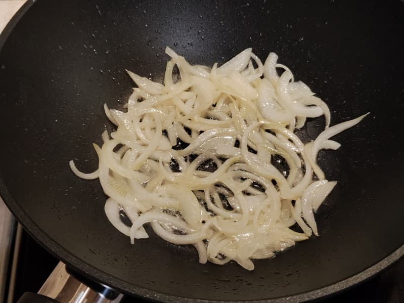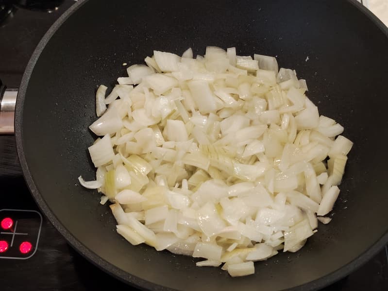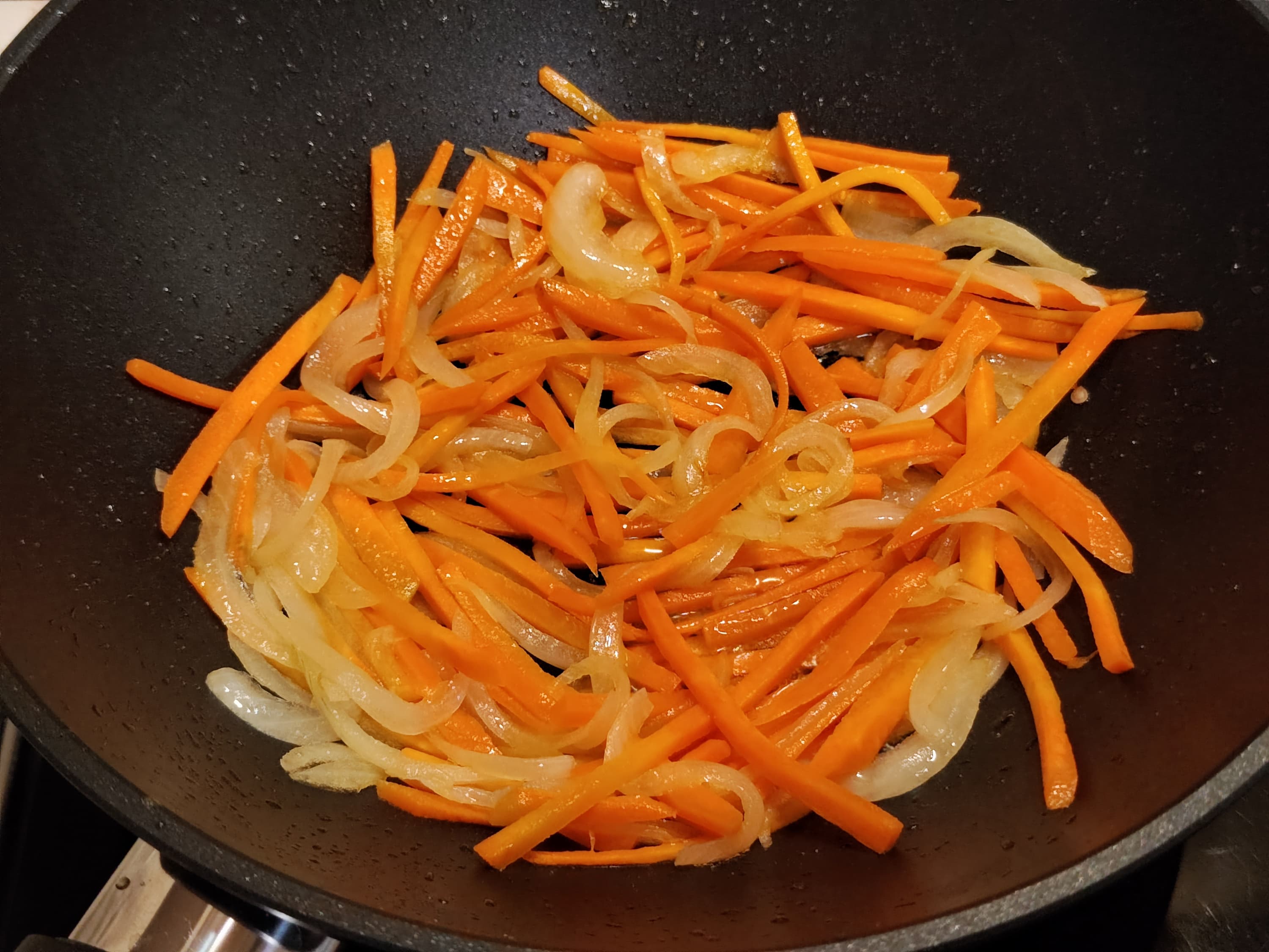 Начали обжарку с репчатого лука. Когда он немного подрумянился, добавили морковь. Перемешивали часто.