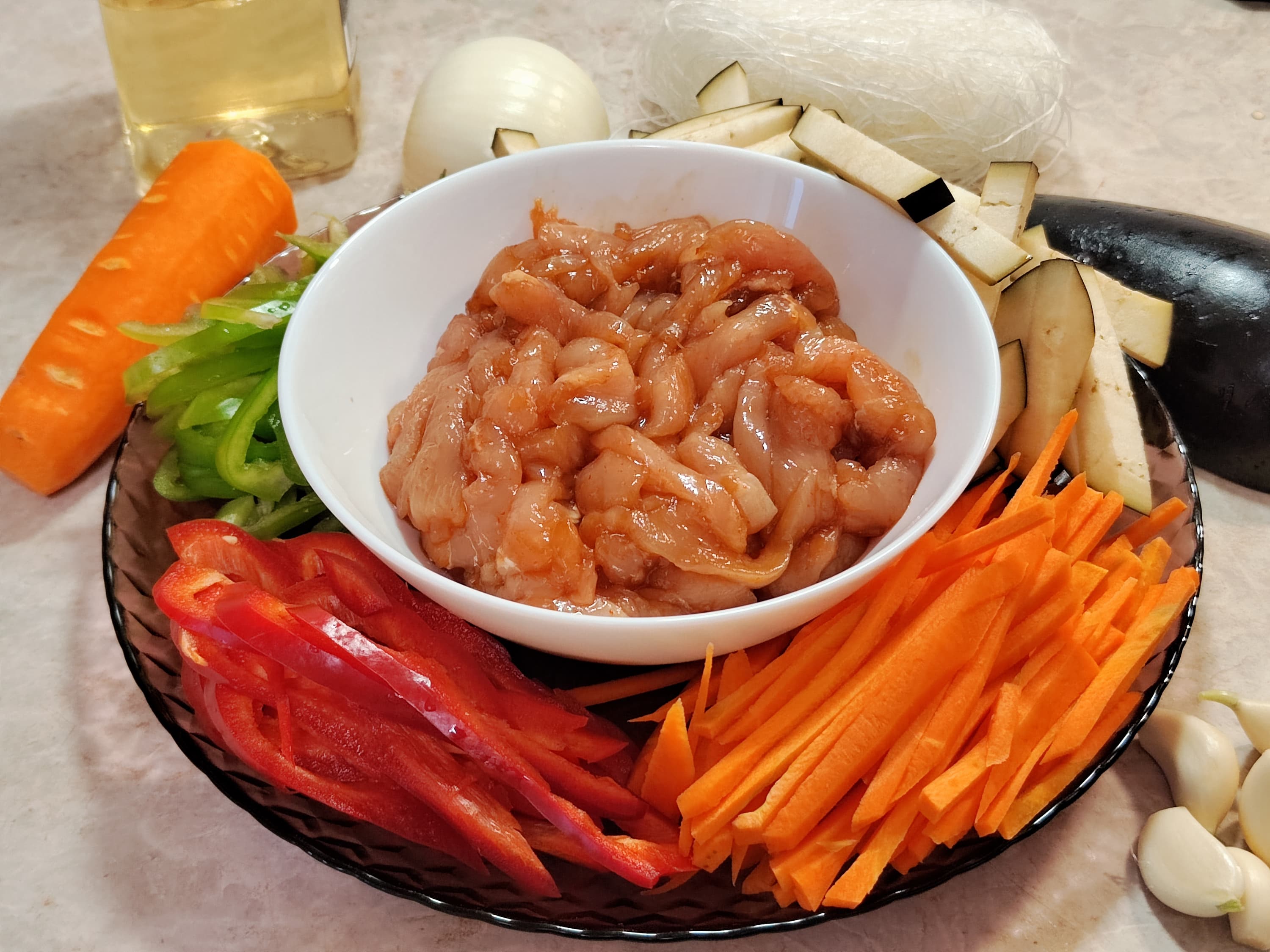 Пока кипятилась вода для лапши, подготовили все продукты для блюда, поскольку во время приготовления будет некогда дочищать чеснок или дорезать болгарский перец.